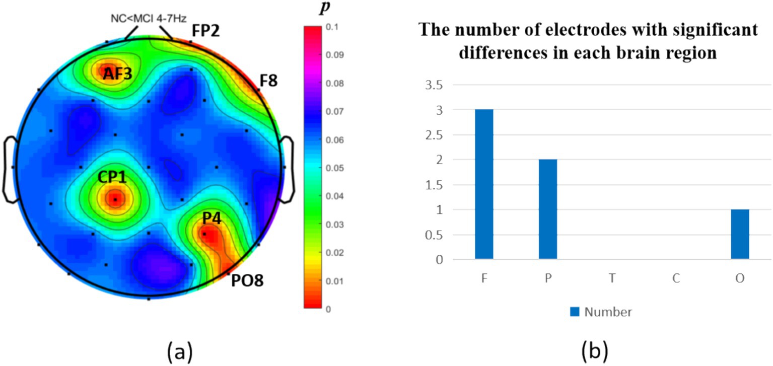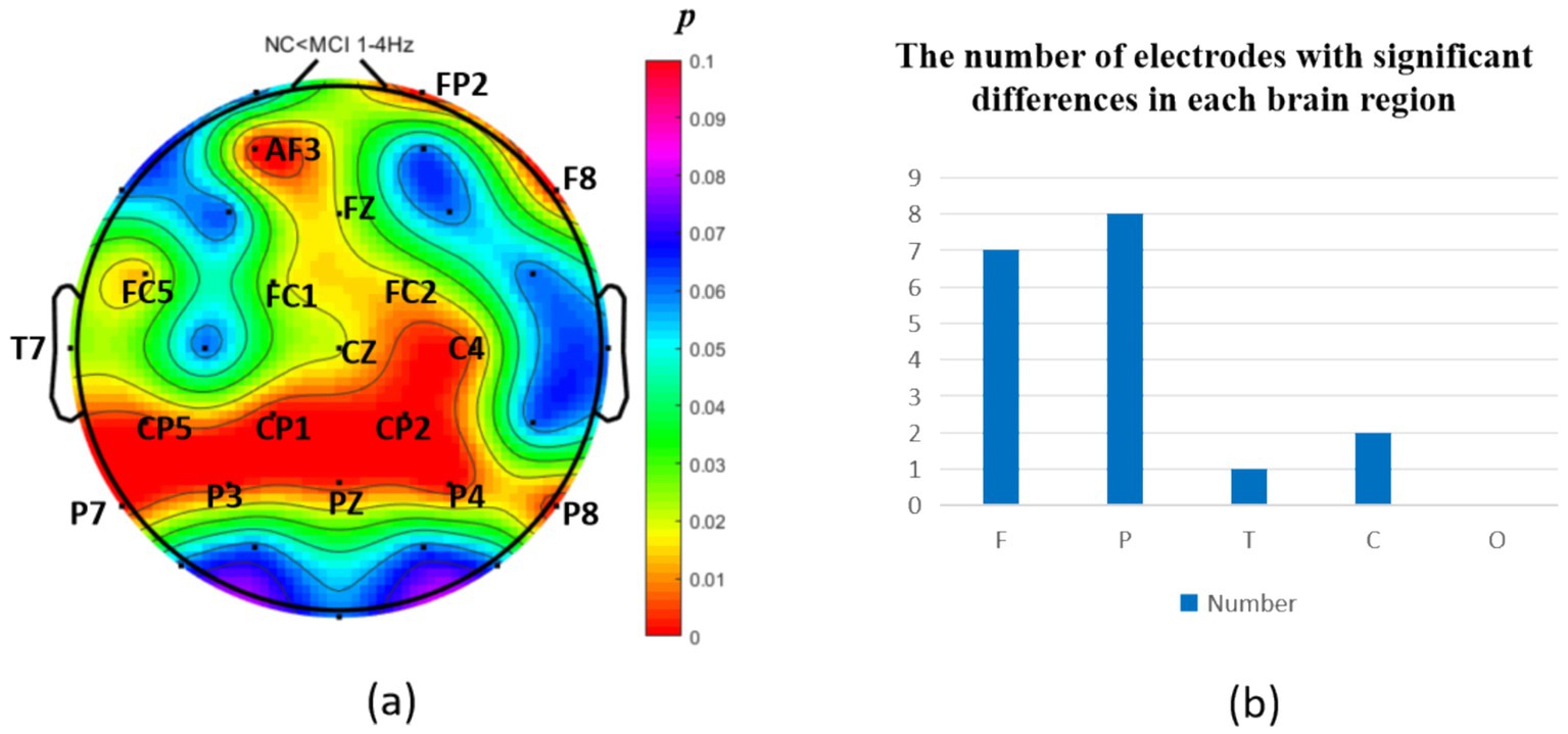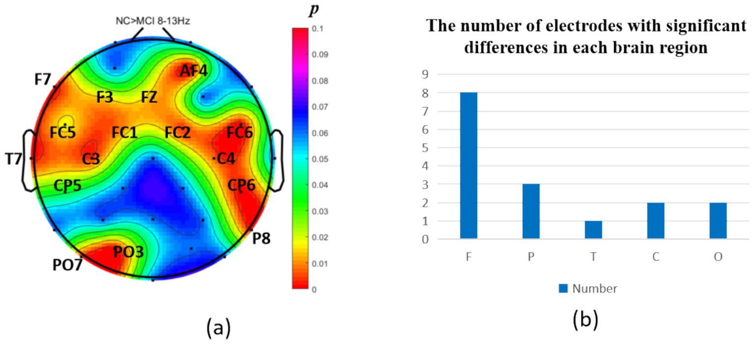 Figure 6. Statistical analysis of α oscillation distribution between NC and MCI. (a) Distribution of electrodes with significant differences in brain regions. (b) Statistics on the numbers of electrodes with significant differences based on brain regions. NC < MCI. (p < 0.05) (FDR corrected). F, frontal lobe; O, occipital lobe; P, parietal lobe; T, temporal lobe; C, central district.