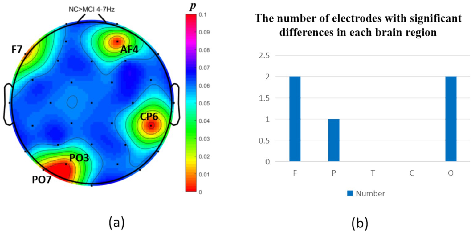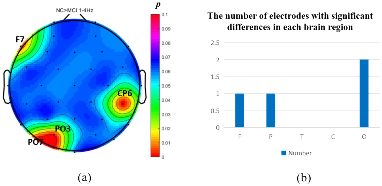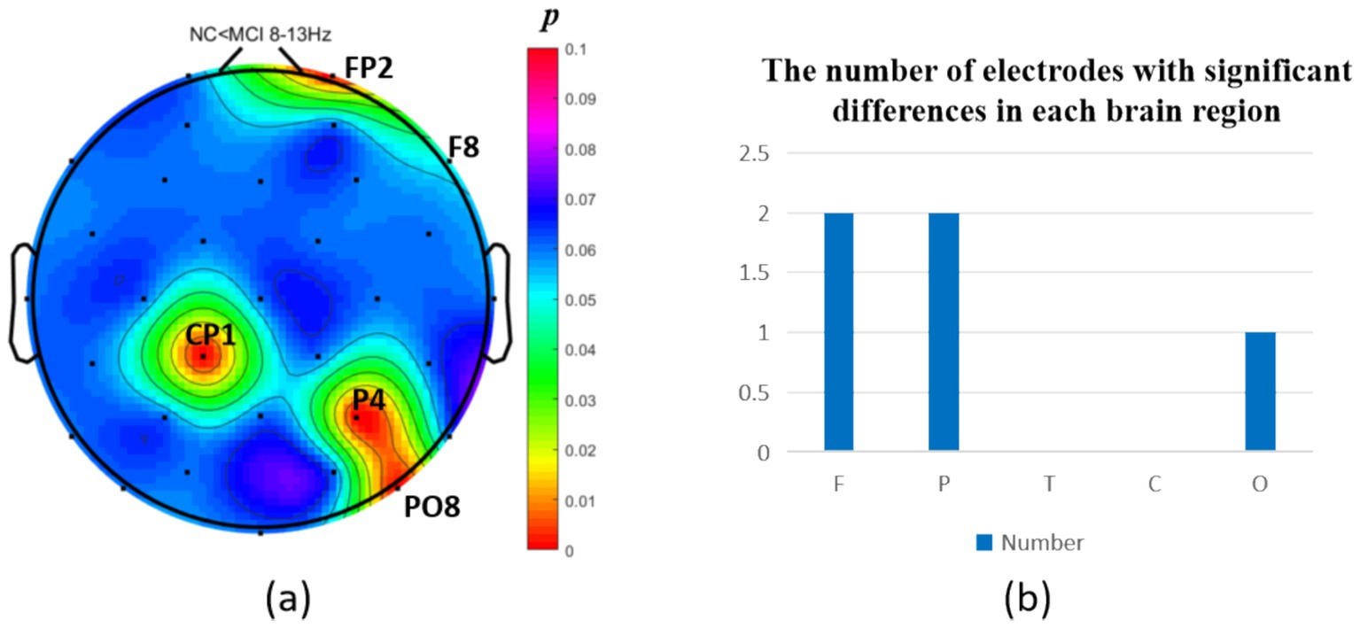 Figure 6. Statistical analysis of α oscillation distribution between NC and MCI. (a) Distribution of electrodes with significant differences in brain regions. (b) Statistics on the numbers of electrodes with significant differences based on brain regions. NC < MCI. (p < 0.05) (FDR corrected). F, frontal lobe; O, occipital lobe; P, parietal lobe; T, temporal lobe; C, central district.