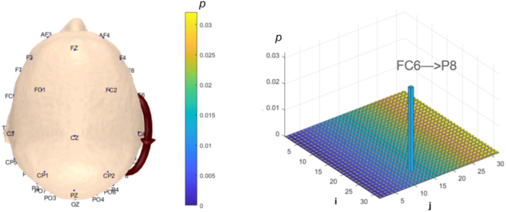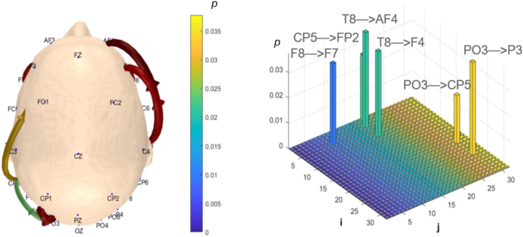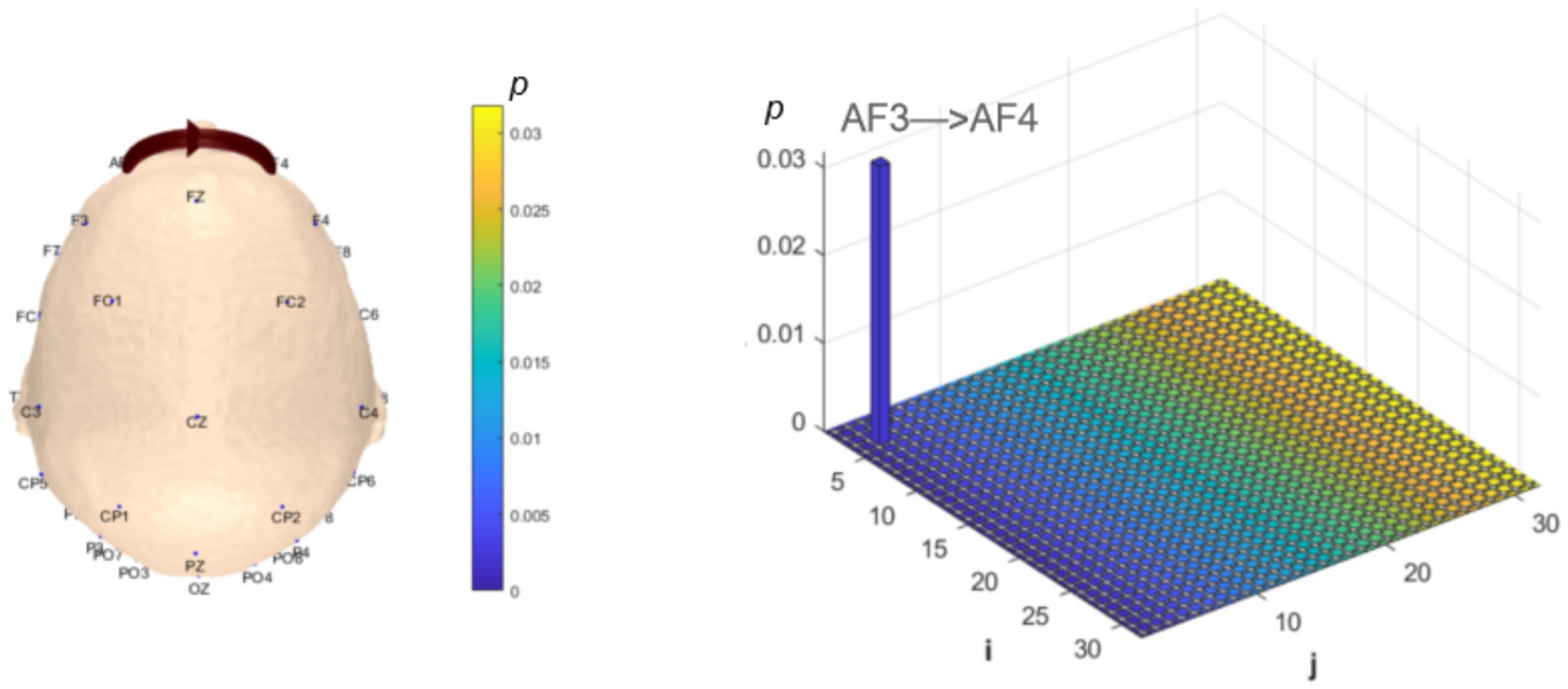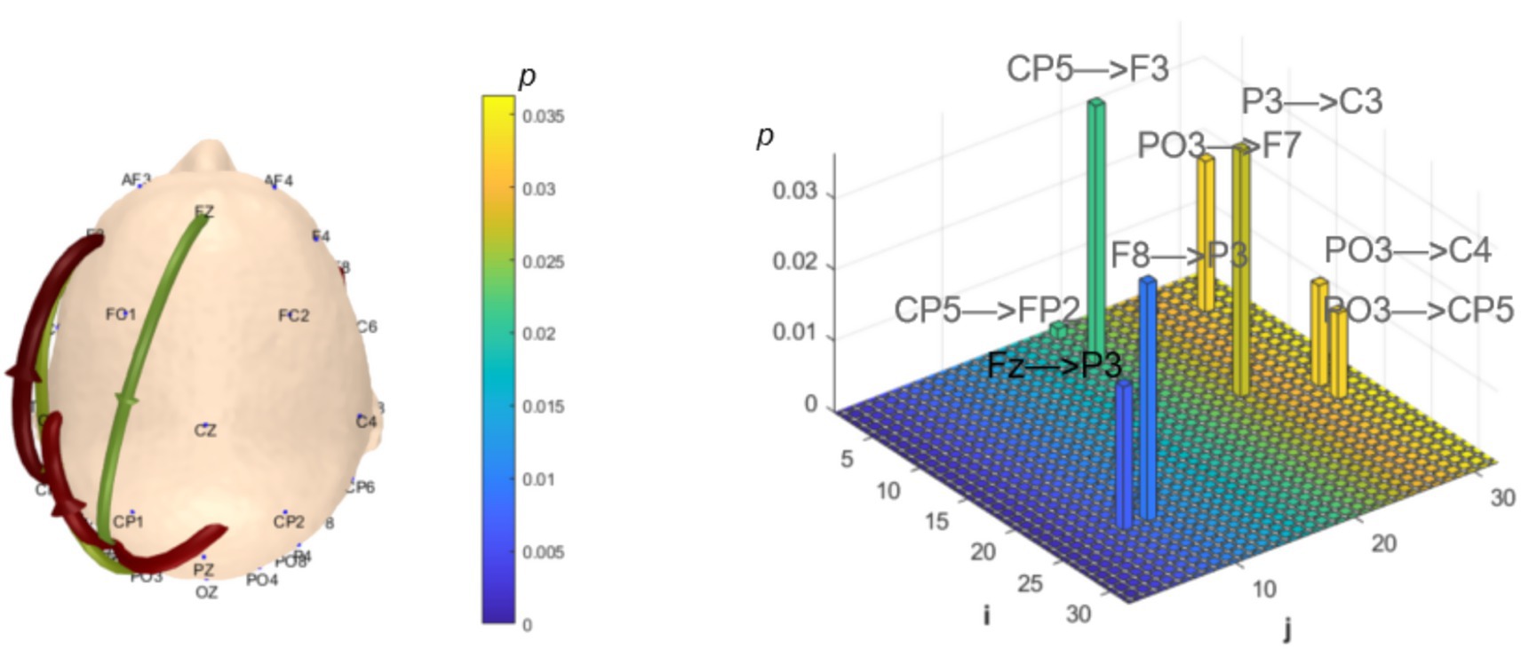 We implemented DTF to model causal brain networks. DTF characterizes directional information flow between multichannel signals based on Granger causality principles. A 32-channel multivariate autoregressive (MVAR) model was constructed: