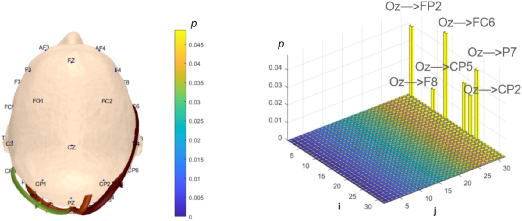 Figure 11. Statistical analysis of α-band dynamic network connectivity between NC and MCI. The i-axis and j-axis represent 32 EEG electrodes respectively, with functional connectivity directed from j to i (NC < MCI, p < 0.05, FDR-corrected).