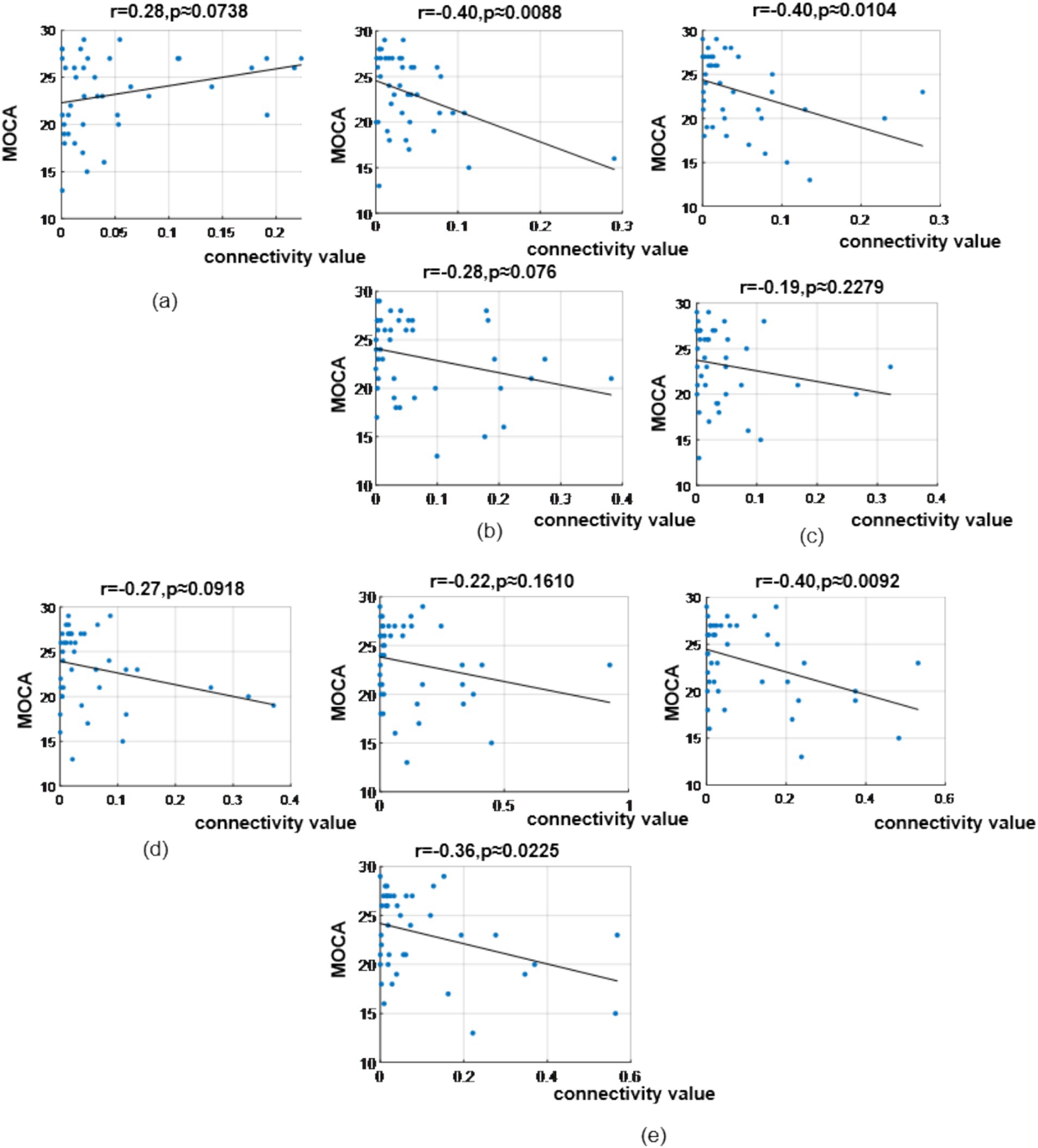 Figure 13. Correlation analysis results between significantly difference brain functional connectivity and MoCA scores in θ-band. (a) Correlation between MoCA scores and the prefrontal → prefrontal functional connectivity (F8 >> F7). (b) Correlation between MoCA scores and the prefrontal → parietal functional connectivity (FC6 >> P8). (c) Correlations between MoCA scores and two temporal → prefrontal functional connectivity (top: T8 >> AF4; bottom: T8 >> F4). (d) Correlations between MoCA scores and two occipital → parietal functional connectivity (top: PO3 >> CP5; bottom: PO3 >> P3). (e) Correlation between MoCA scores and the parietal → prefrontal functional connectivity (CP5 >> FP2).