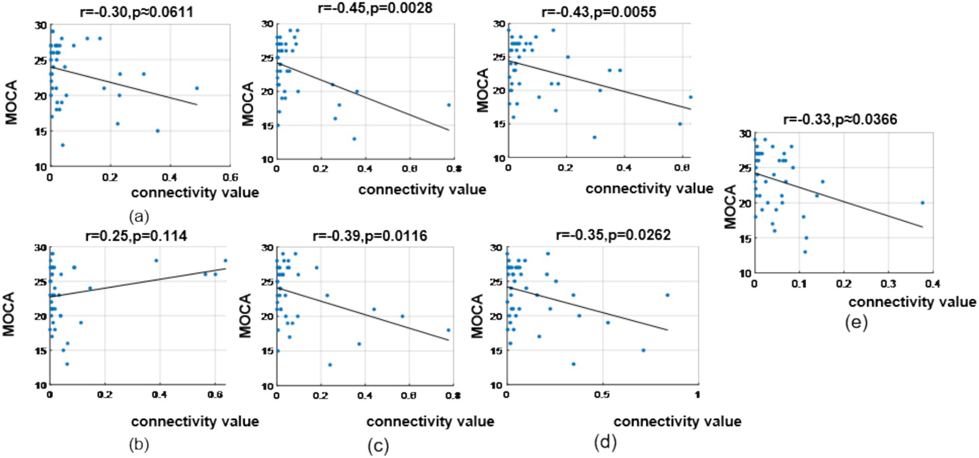 Figure 12. Correlation analysis results between significantly difference brain functional connectivity and MoCA scores in δ-band. (a) Correlation between MoCA scores and the prefrontal → prefrontal functional connectivity (AF3> > AF4). (b) Correlations between MoCA scores and two prefrontal → parietal functional connectivity (top: Fz> > P3; bottom: F8> > P3). (c) Correlations between MoCA scores and two parietal → prefrontal functional connectivity (top: CP5 >> FP2; bottom: CP5 >> F3). (d) Correlation between MoCA scores and the parietal → central functional connectivity (P3 >> C3). (e) Correlations between MoCA scores and occipital → prefrontal/central/parietal functional connectivity (top-left: PO3 >> F7; bottom-left: PO3 >> C4; top-right: PO3 >> CP5).