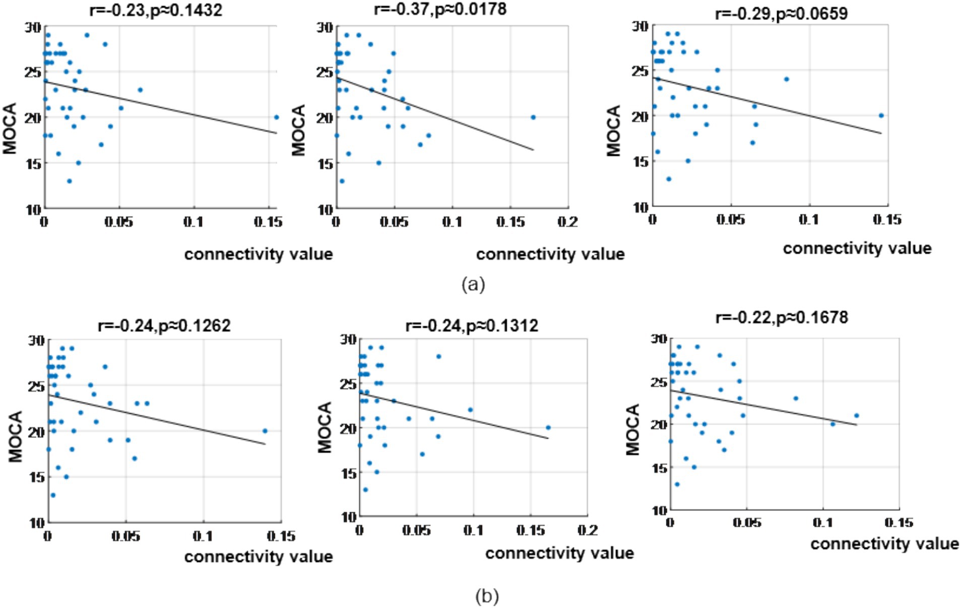 Figure 14. Correlation analysis results between significantly difference brain functional connectivity and MoCA scores in α-band. (a) Correlations between MoCA scores and three occipital → prefrontal functional connectivity (Oz >> FP2, Oz >> F8, Oz >> FC6). (b) Correlations between MoCA scores and three occipital → parietal functional connectivity (Oz >> CP5, Oz >> CP2, Oz >> P7).