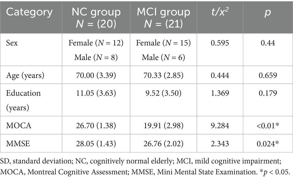 We enrolled a total of 41 elderly participants from Chengdu’s Min’an community, comprising 21 individuals with MCI and 20 NC. The research protocol was approved by the Ethics Committee of West China Medical School, Sichuan University. All participants provided written informed consent prior to enrollment. The baseline characteristics of participants are presented in Table 1.
