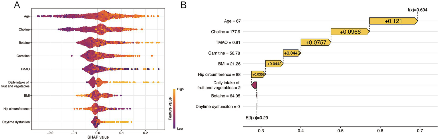 The random forest model showed the bestperformance (AUC = 0.74, 95% CI: 0.677–0.801; sensitivity = 0.72). SHAP analysis identified age, choline, carnitine, betaine, TMAO, daily intake of fruit and vegetables, body mass index, hip circumference, and daytime dysfunction as key predictors.
