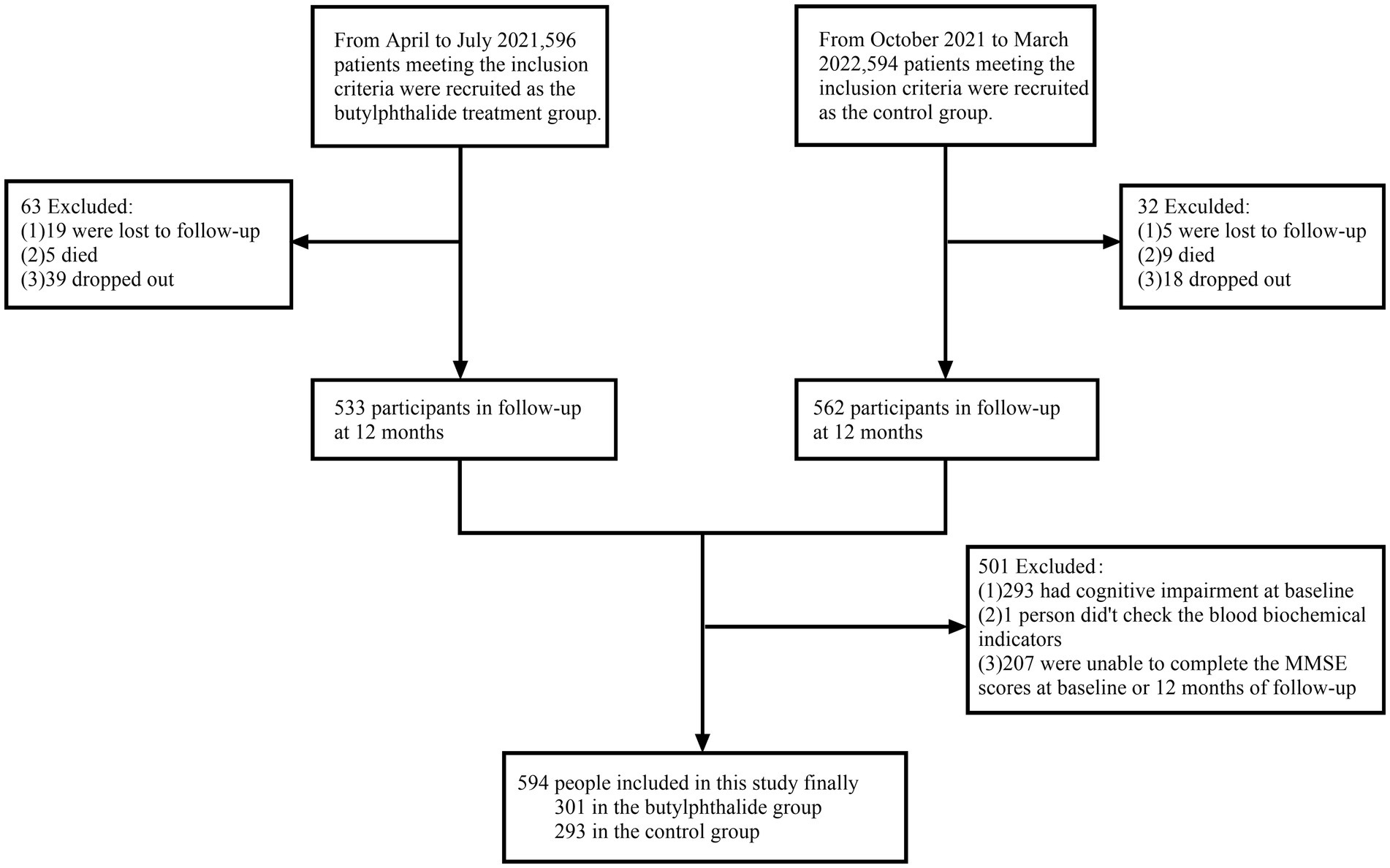 Figure 1. Flow chat of participants selection. This figure showed that from April 2021 to March 2022, 1,190 ischemic stroke patients were screened. A total of 596 and 594 participants were initially enrolled in the NBP treatment group and control group, respectively. After exclusions (lost to follow-up, death, dropout, and baseline cognitive impairment), 594 participants (301 in the NBP group and 293 in the control group) were included in the final analysis.