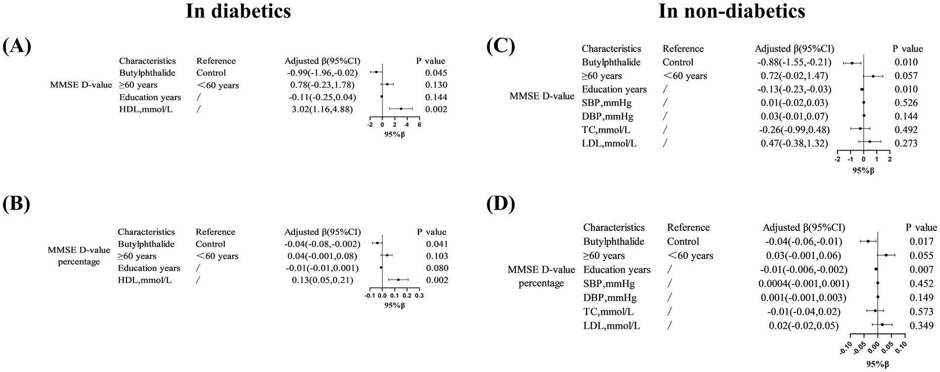 Figure 2. Multivariate linear regression analysis of MMSE score changes in diabetic patients treated with NBP. (A–D) Showed that associations between NBP treatment and MMSE score changes (ΔMMSE) in diabetic subgroups. Variables included education years and HDL levels. Results are presented as adjusted β coefficients (95% CI) and p-values. Significance levels: p < 0.05.