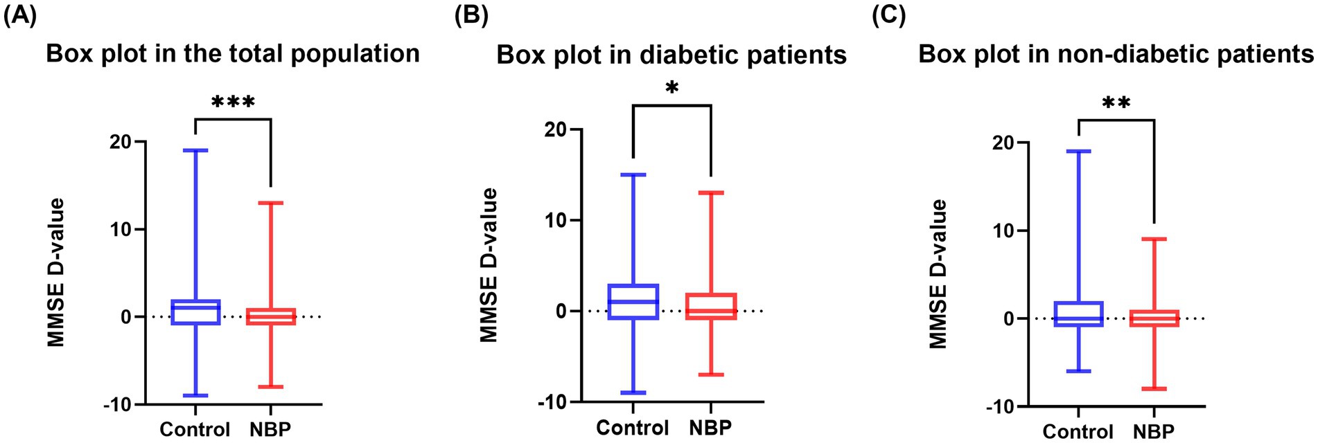 In the diabetic subgroup, the adjusted regression coefficients for ΔMMSE and its percentage were β = −0.99 (95% CI, −1.96 to −0.02, p = 0.045) and β = −0.04 (95% CI, −0.08 to −0.002, p = 0.041), respectively. Similarly, in non-diabetic patients, NBP treatment was significantly associated with a smaller cognitive decline: β = −0.88 (95% CI, −1.55 to −0.21, p = 0.010) and β = −0.04 (95% CI, −0.06 to −0.01, p = 0.017) (Figure 2). Figure 3 illustrated the distribution of 12-month MMSE change (Figure 3). In the total population, the median ΔMMSE was significantly higher in the NBP group than in controls (p < 0.01, Figure 3A). The diabetic subgroup showed the same trend (p < 0.05, Figure 3B), while the non-diabetic subgroup exhibited the largest improvement (p < 0.001, Figure 3C), consistent with the primary analyses.