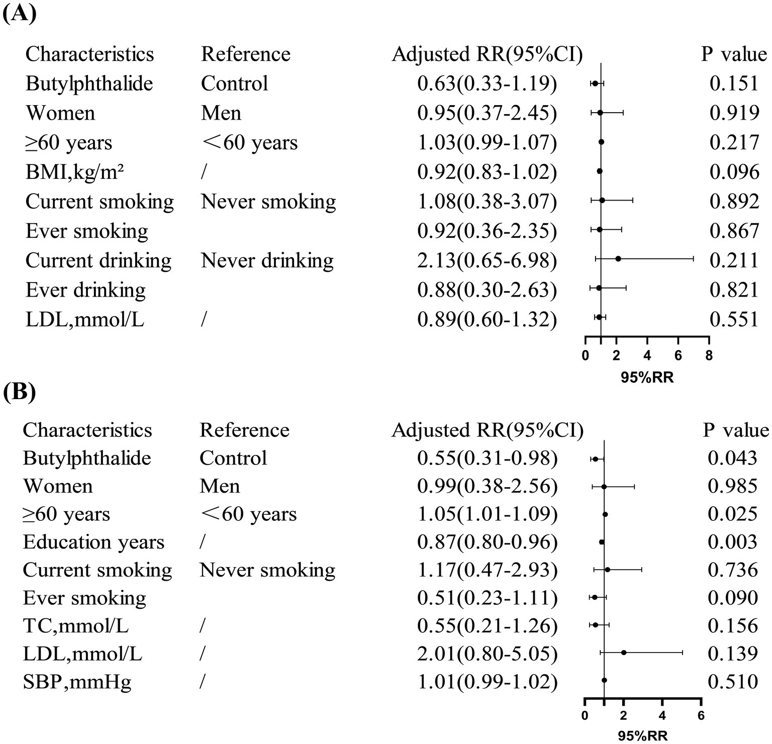 Figure 4. Risk ratios (RR) for cognitive decline in diabetic and non-diabetic subgroups. (A) Showed that in diabetic patients, NBP treatment showed no significant reduction in cognitive decline risk (adjusted RR = 0.63, 95% CI: 0.33, 1.19). (B) Showed that in non-diabetic patients, NBP significantly reduced the risk (adjusted RR = 0.55, 95% CI: 0.31, 0.98). Covariates included age, education years, and smoking status.
