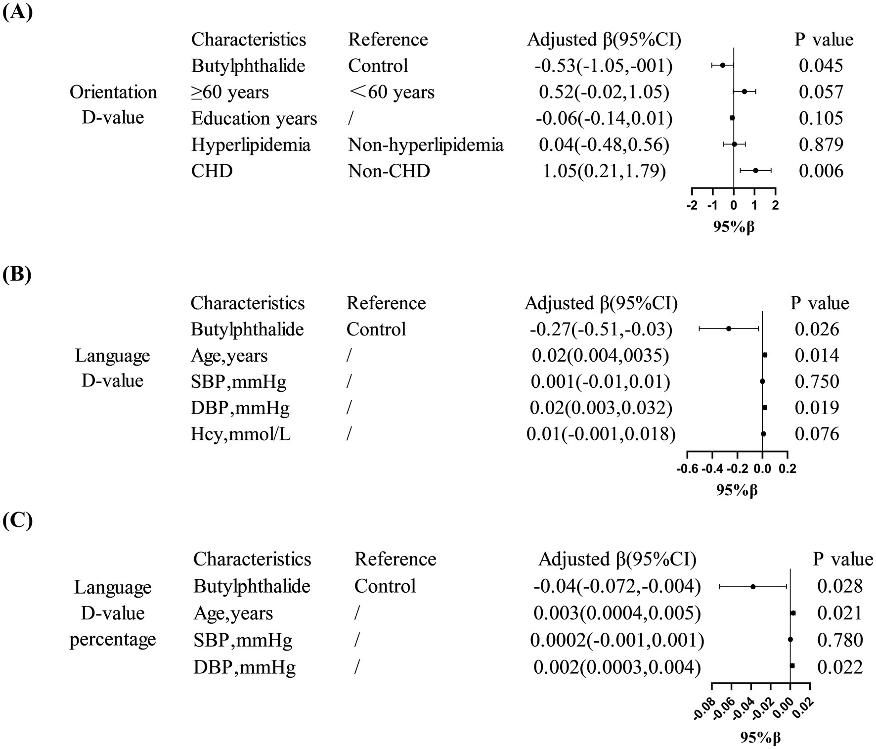Figure 5. Domain-specific cognitive effects of NBP treatment. (A) Showed that in diabetic patients, NBP improved orientation ability (adjusted β = −0.53, 95% CI: −1.05, −0.001). (B,C) Showed that in non-diabetic patients, NBP preserved language function (adjusted β = −0.27, 95% CI: −0.51, −0.03).