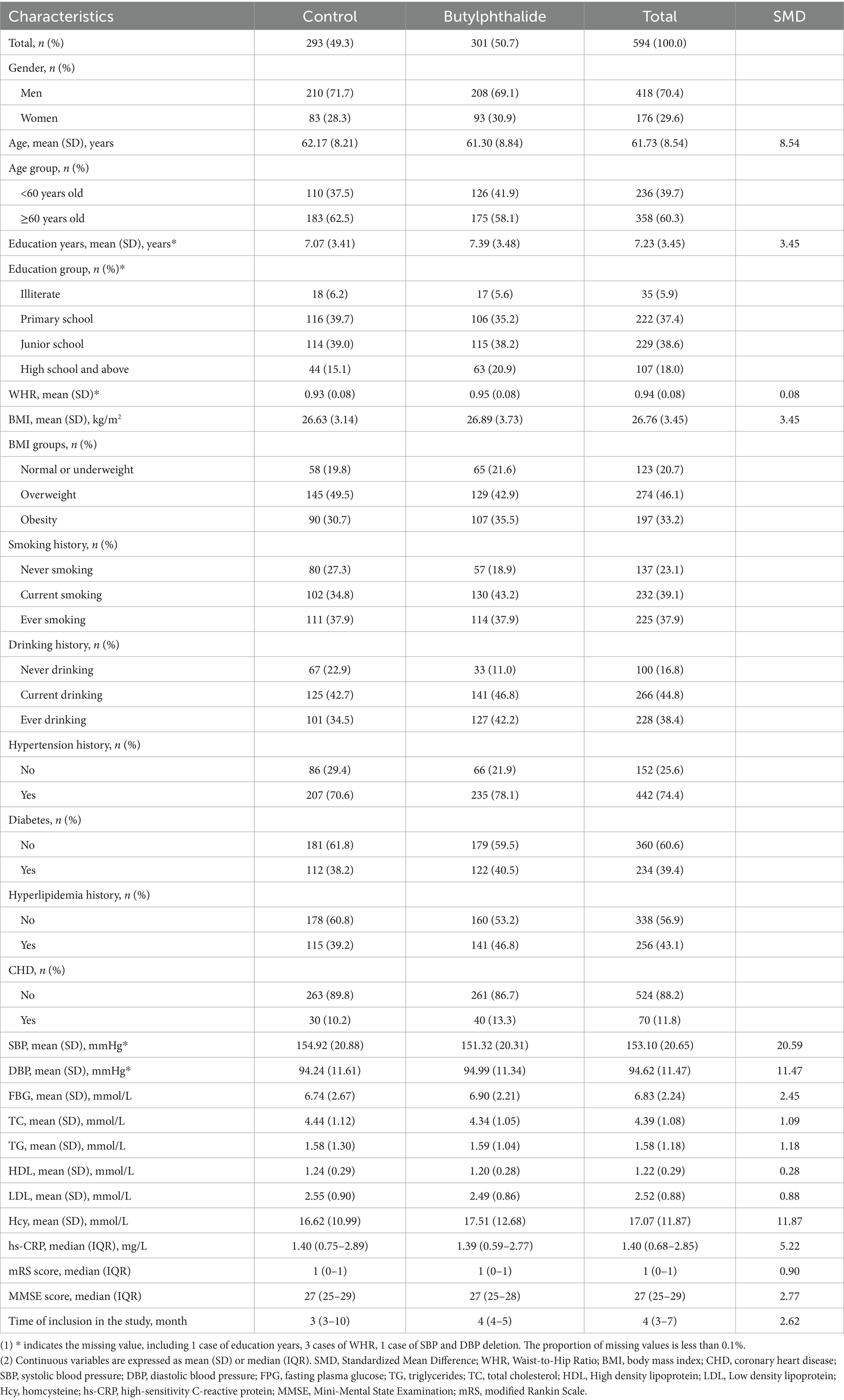 Between April 2021 and March 2022, a total of 1,190 IS patients were screened for eligibility. Among them, 596 participants were allocated to the NBP treatment group and 594 to the control group. After 1 year of follow-up, excluding individuals with incomplete cognitive data and those with cognitive impairment at baseline, 594 participants were included in the final analysis: 301 in the NBP group and 293 in the control group (Figure 1).
