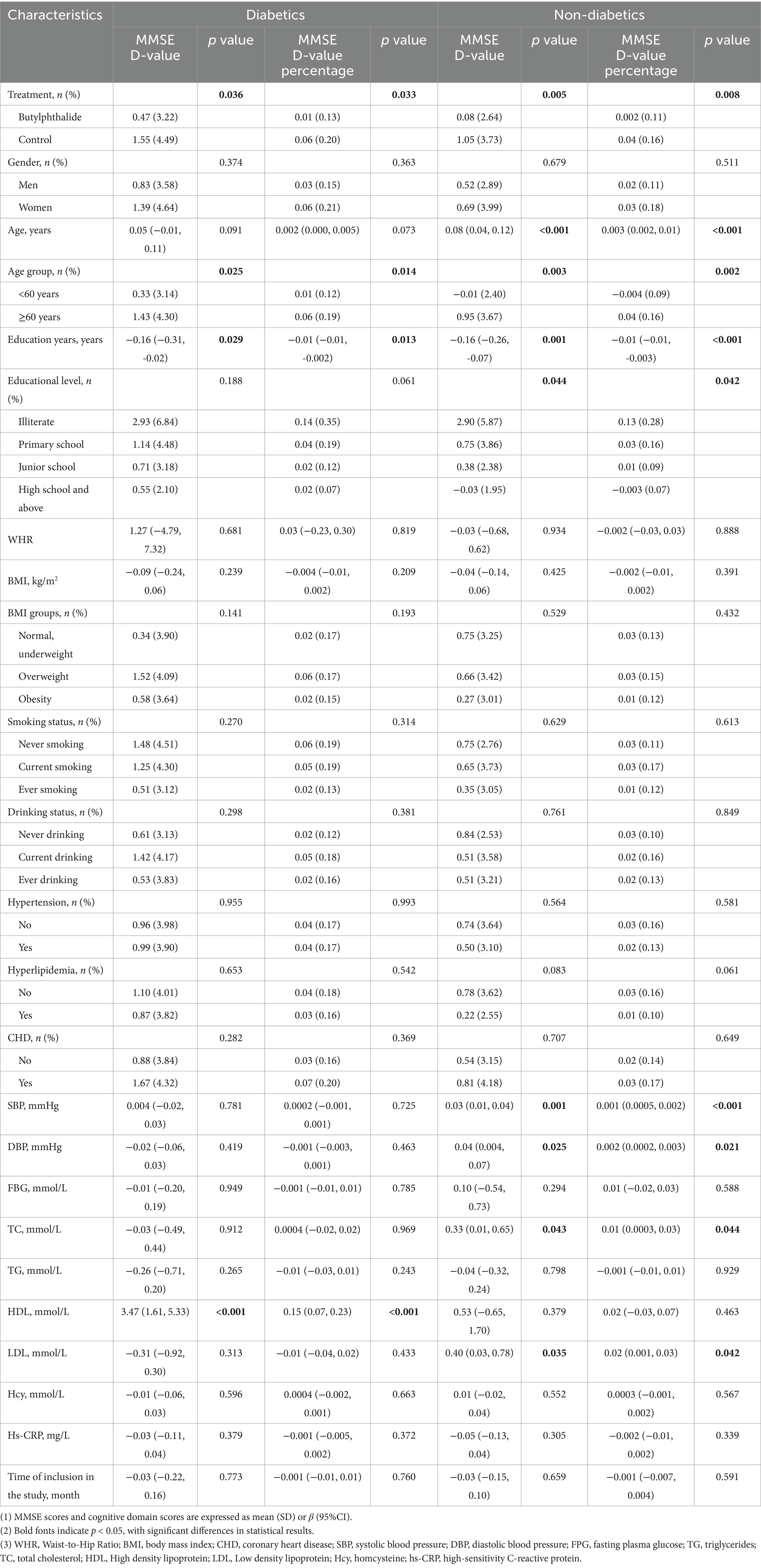 Beyond the effect of NBP treatment, age and education level are well-recognized predictors of cognitive decline. In our analysis, we found that age ≥60 years was associated with an increased risk of cognitive decline in non-diabetic patients, while each additional year of education was associated with a reduced risk. This highlights the importance of including these demographic factors in our regression models to ensure an accurate assessment of NBP’s efficacy. However, these results were not significant in the diabetic subgroup. This may be due to the complex internal environment associated with the disease state of diabetes, or it may be attributed to the smaller sample size, which limited our ability to fully detect specific relationships. BMI, hypertension, and hyperlipidemia are also important factors that may influence cognitive outcomes (Chen et al., 2022; Hou et al., 2019). Although these factors were included in our multivariate models, their specific impact on the efficacy of NBP in diabetic and non-diabetic patients warrants further investigation. Given the established role of diabetes in cognitive decline and its potential interaction with the mechanisms of NBP, we considered diabetes status as a potential effect modifier in our study. Our subgroup analysis showed differential effects of NBP in diabetic and non-diabetic patients, suggesting that diabetes may indeed modify the therapeutic response to NBP. Future studies should explore other potential effect modifiers, such as genetic predispositions, lifestyle factors (e.g., smoking, alcohol use), and comorbid conditions (e.g., cardiovascular disease), to provide a more comprehensive understanding of the factors influencing NBP’s efficacy.