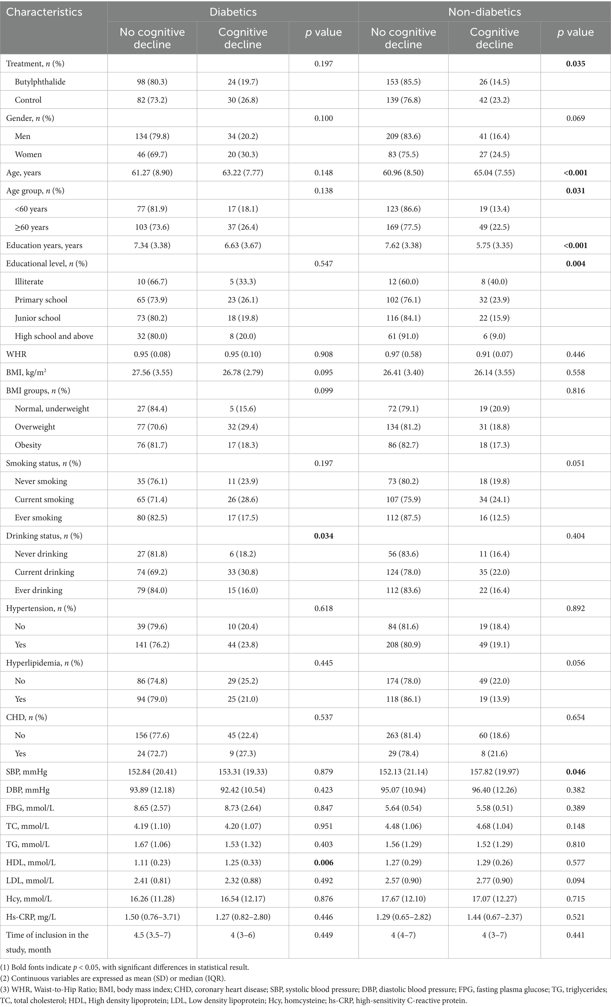Therefore, this study aimed to evaluate the differential effects of 12-month NBP therapy on cognitive function in diabetic and non-diabetic IS patients in a rural Chinese community. The findings will provide valuable evidence for optimizing NBP therapy and developing individualized strategies for the secondary prevention of cognitive impairment in stroke survivors.