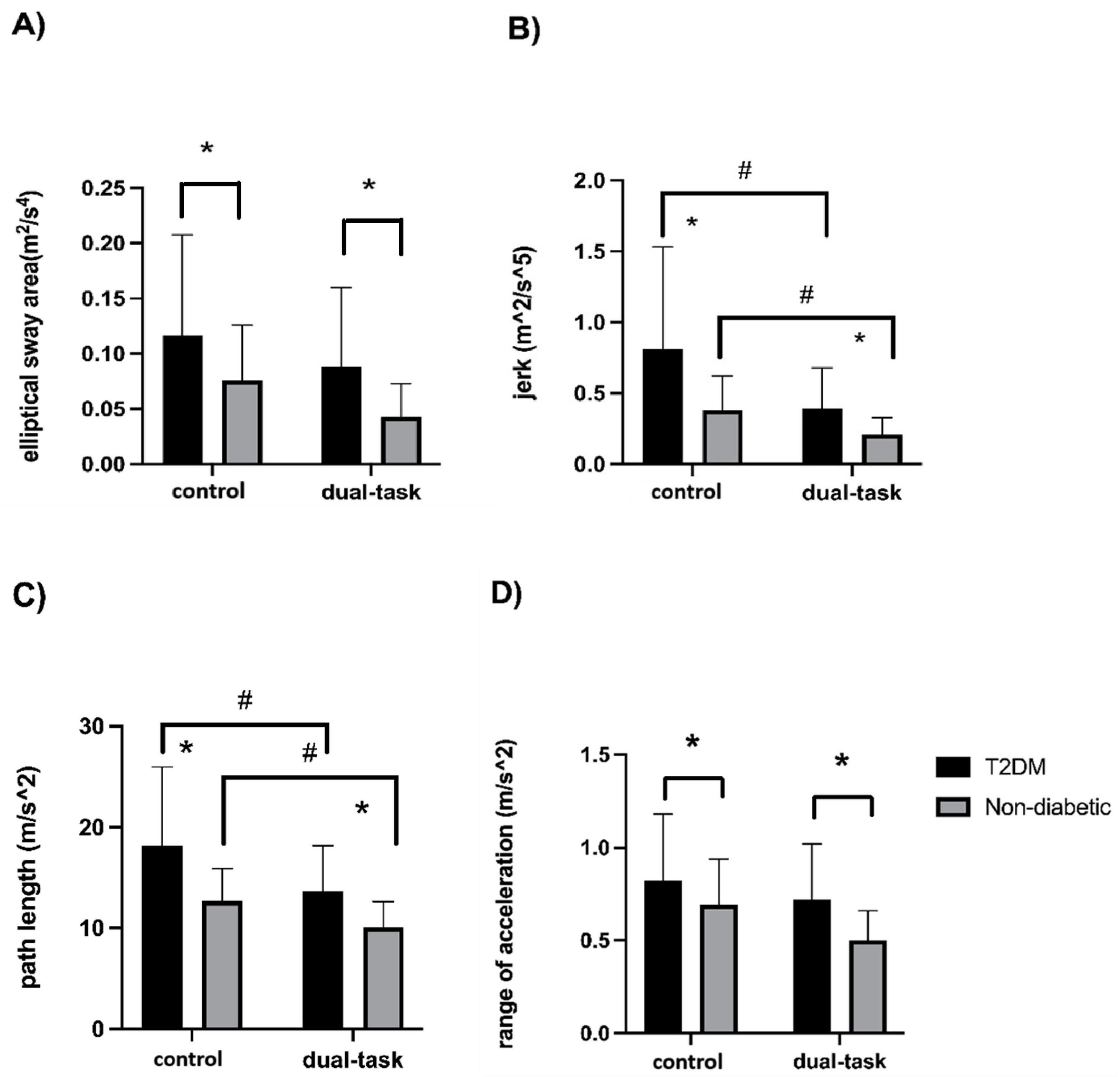 Figure 1. Single-scale measures of elliptical sway area (A) jerk (B) path length (C), and range of acceleration (D) by group during the control (i.e., quiet standing) and visual search (i.e., dual-task) condition. Compared to non-diabetic, the T2DM group displayed greater elliptical sway area (p = 0.007), jerk (p = 0.001), path length (p < 0.0001), and range of acceleration (p = 0.006), irrespective of task condition. Across participants, jerk (p = 0.002) and path length (p = 0.002) were lower during the performance of the visual search compared to control condition independent of age, sex, and hypertension. *Denotes a significant difference between the T2DM and non-diabetic groups; #Denotes a significant difference between single-task and dual-task conditions.