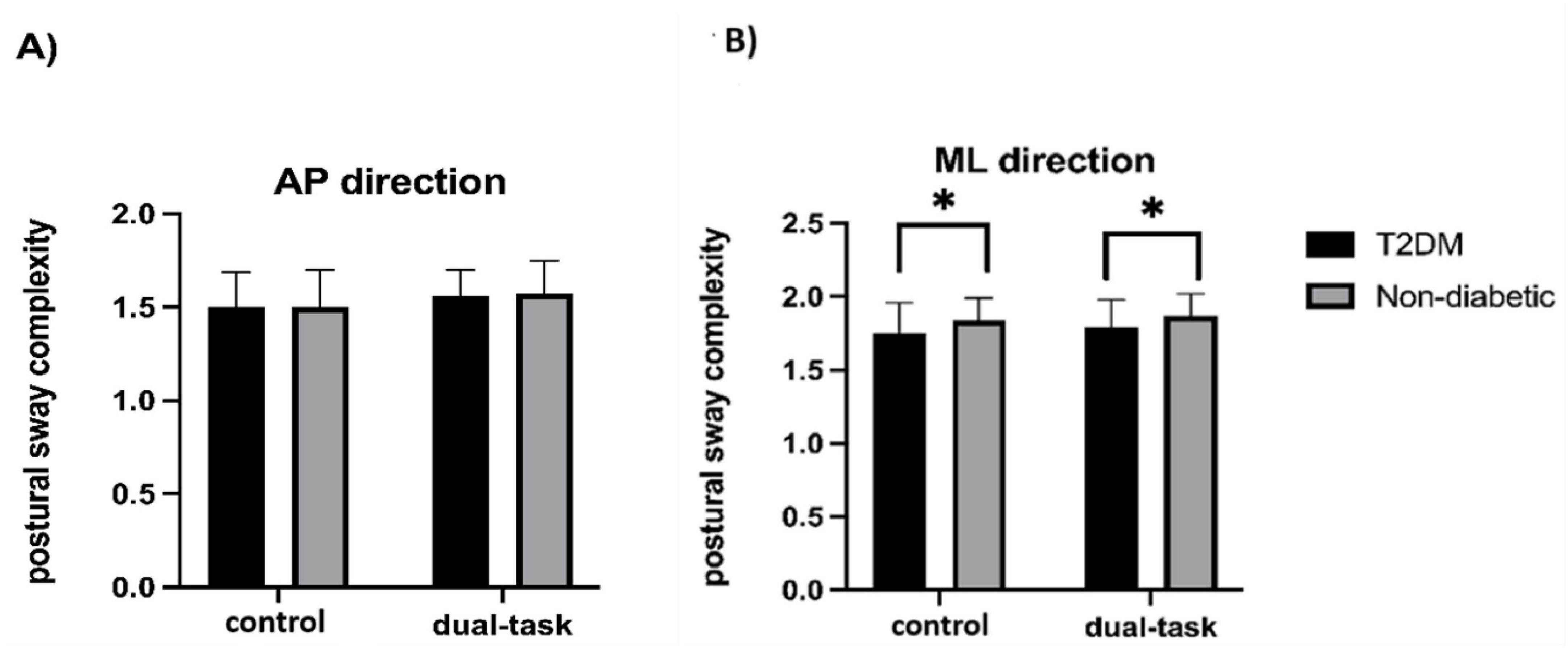 Figure 2. Postural sway complexity in the anterior-posterior (AP) (A) and medial-lateral (ML) (B) directions by group during the control (i.e., quiet standing) and visual search (i.e., dual-task) condition. The T2DM displayed lower ML sway complexity compared to the non-diabetic group irrespective of task condition (Unadjusted: p = 0.02). After controlling for age, sex, and hypertension, the group effect on ML sway complexity trended toward significance (p = 0.05). *Denotes a significant difference between the T2DM and non-diabetic groups.
