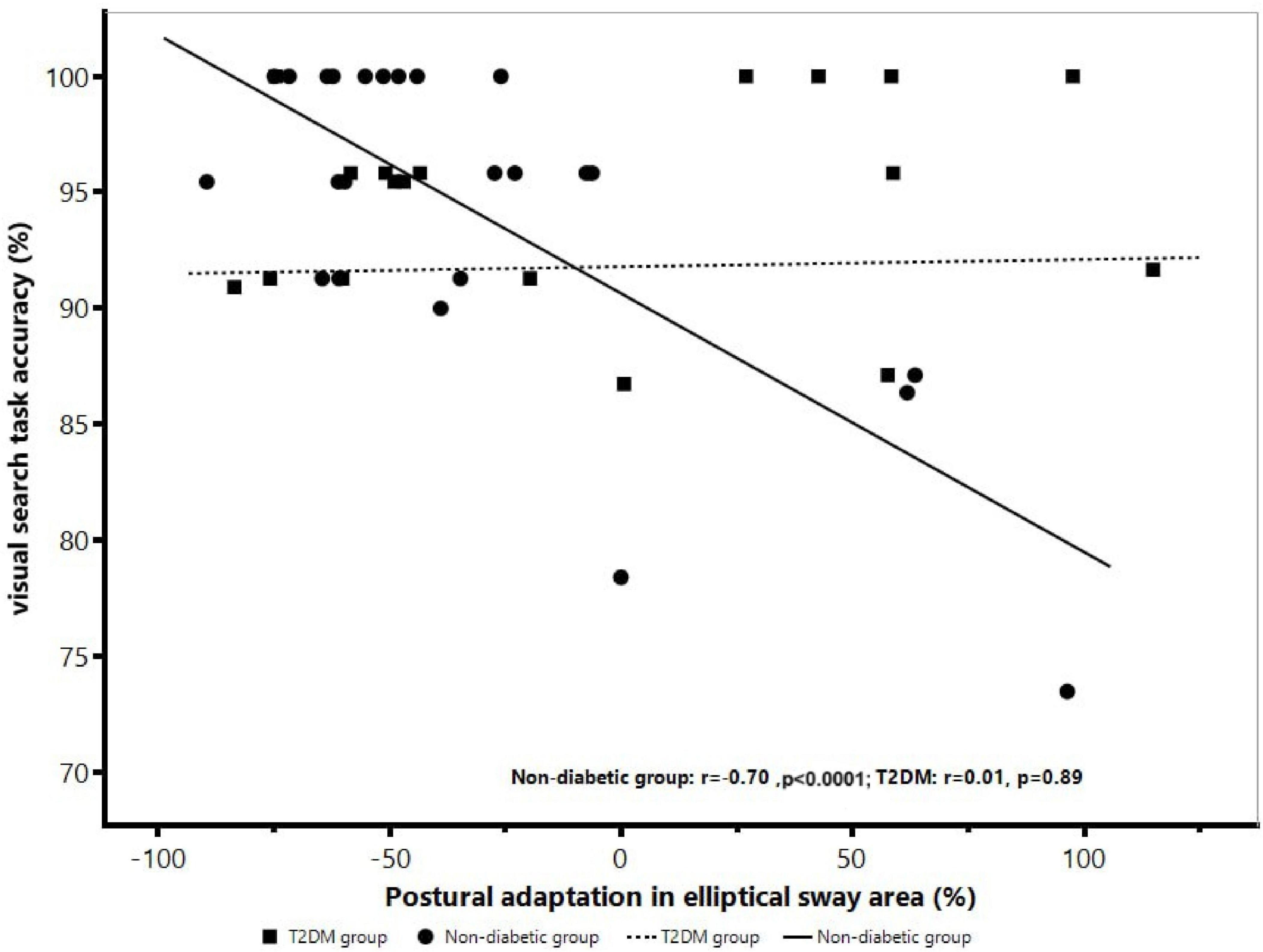 Figure 3. The association between visual search performance and postural adaptation in elliptical sway area within the non-diabetic group and T2DM group. Within the non-diabetic group only, those with greater percent increase in elliptical sway area demonstrated lower visual search task accuracy independent of age, sex, and hypertension (r = –0.70, p < 0.0001). However, this association was not present in the T2DM group (r = 0.01, p = 0.89).