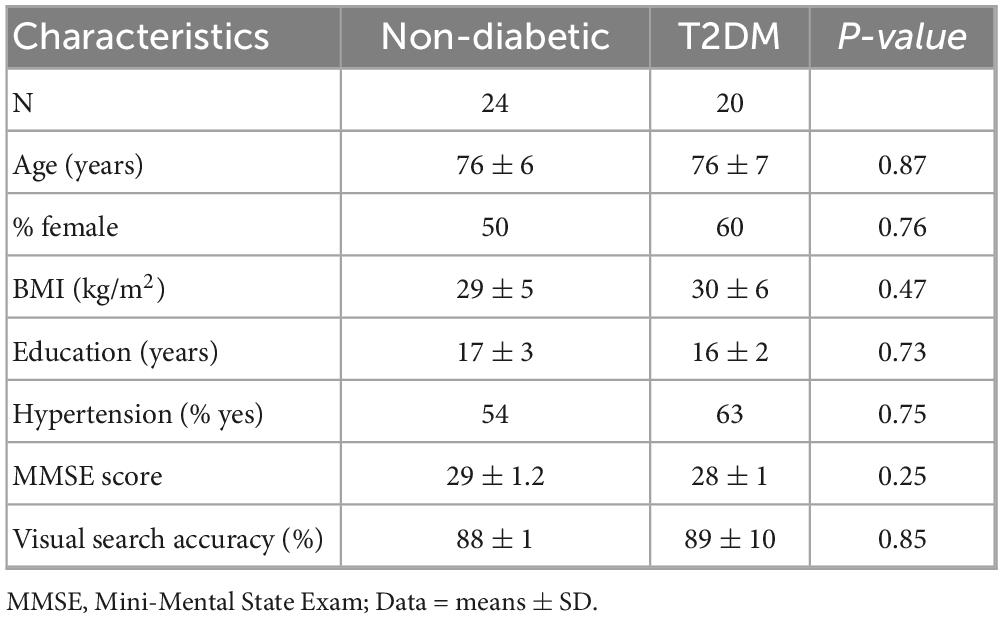 Forty-four participants (non-diabetic = 24; T2DM = 20) were included in the analyses. Groups were similar in age, sex distribution, BMI, years of education, hypertension status, global cognition (i.e., MMSE scores), and visual performance accuracy (p > 0.25) (Table 1). All participants reported being able to clearly see the visual search letters presented during the task. All postural sway outcomes were normally distributed (Table 2).