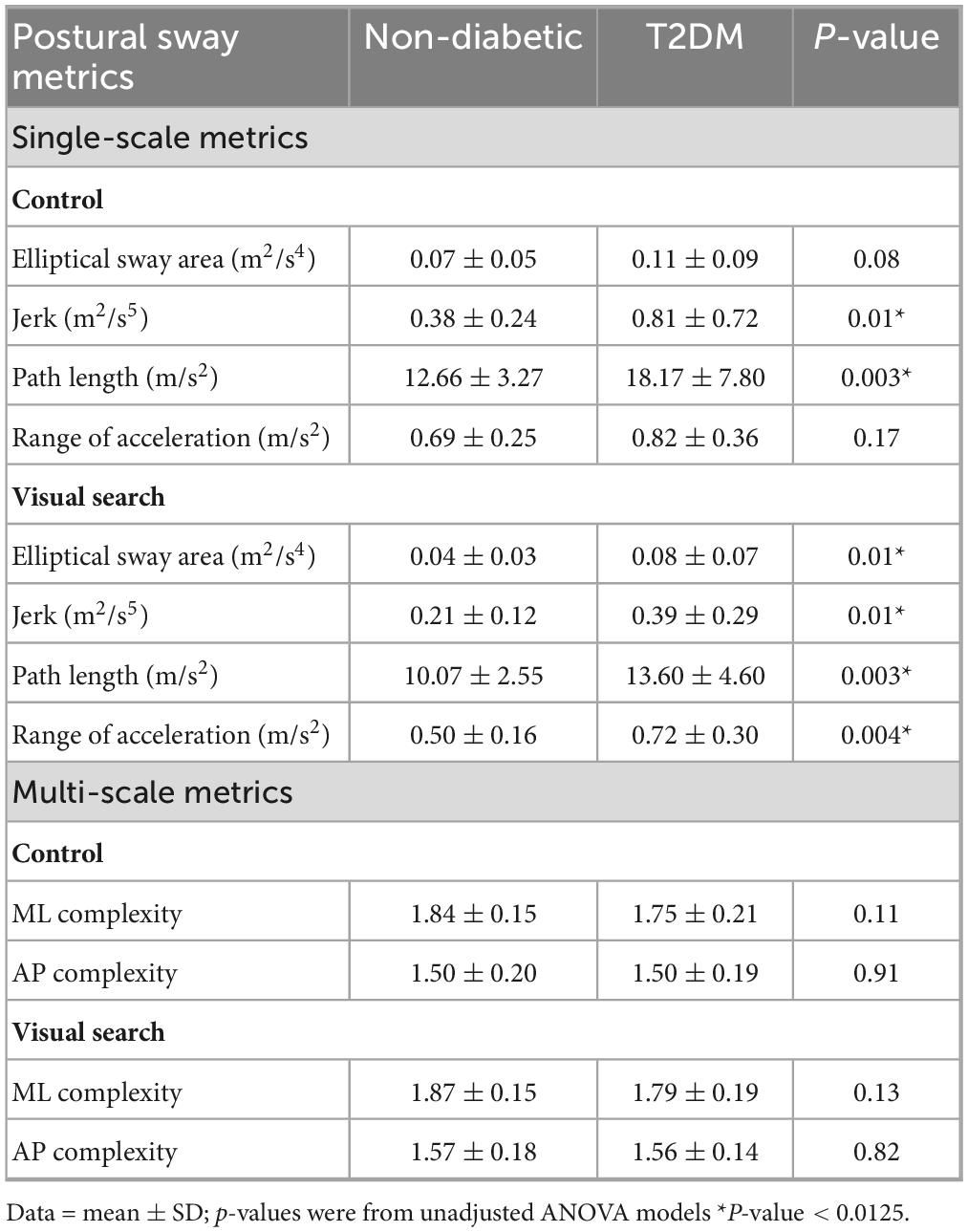 Standing postural control can be traditionally characterized by examining the characteristics of postural sway of the body, as measured by center-of-pressure (COP) fluctuations. These measurements can be derived from a single scale of time (e.g., area, path length) or more recent multi-scale metrics, such as multi-scale entropy (MSE), which are designed to capture the information content or “complexity” of the signal (Peterka, 2002). Prior research has demonstrated that visual search tasks can influence the temporal dynamics of sway in older adults (Jor’dan et al., 2015; Koslucher et al., 2012), underscoring the sensitivity of postural control to concurrent cognitive demands. Consistent with this line of work, our prior study supported the notion that, in addition to traditional metrics, postural sway complexity during a visual search task may serve as a sensitive marker for detecting postural control changes in older adults with cognitive impairment [i.e., Alzheimer’s disease, mild cognitive impairment (MCI)] (Zhou et al., 2023). However, the impact of performing a visual search task on standing postural sway dynamics in older adults with T2DM has not been investigated.