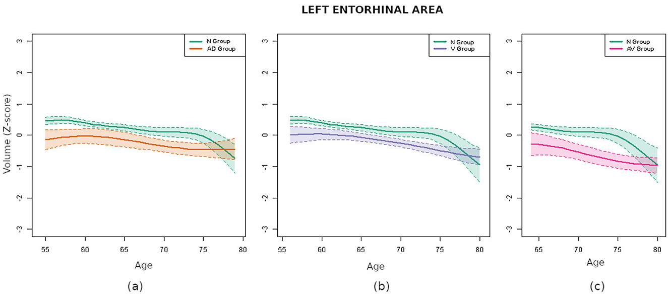 Figure 4. Comparison of the volume curves of the left entorhinal area for the N group (green) and the pathological groups. (a) Comparison corresponding to the AD group (orange). (b) Comparison corresponding to the V group (purple). (c) Comparison corresponding to the AV group (pink).