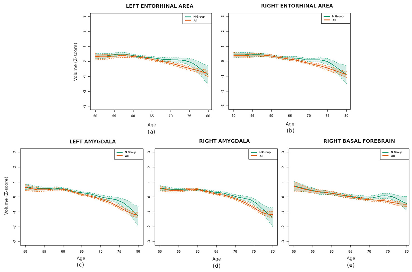 Although the N group was included in the complete database and was the predominant group, disparities in brain region volume curves between the N group and the entire dataset becoae evident. Table 2 (first column) presents the ten regions that exhibited the largest area between the curves. The regions that exhibited the most significant disparities were specifically the entorhinal areas and the amygdalas.