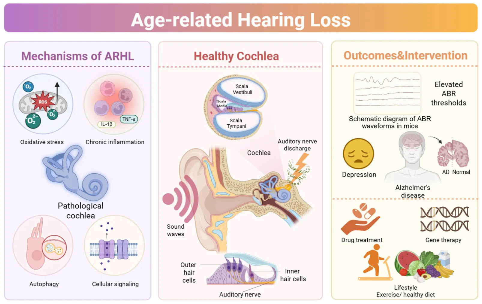 Aging is associated with a decline in the function of multiple organ systems, inner ear is particularly susceptible to the effects of aging (López-Otín et al., 2023). With advancing age, the structure and function of inner ear deteriorate irreversibly, resulting in progressive bilateral sensorineural hearing loss, primarily affecting high-frequency hearing. This condition, commonly referred to as age-related hearing loss (ARHL) or presbycusis. Individuals with ARHL often face challenges in speech discrimination and experience difficulties in sound detection and localization, especially in noisy environments (Bowl and Dawson, 2019). ARHL is the most prevalent sensory deficit among older adults and often leads to social isolation, as well as comorbidities such as frailty, falls, late-onset depression, cognitive decline, and dementia (Lin et al., 2013; Loughrey et al., 2018; Rutherford et al., 2018). According to the World Health Organization, an estimated 2.5 billion people will be affected by hearing loss, with over 500 million individuals experiencing significant impairment due to ARHL (Chadha et al., 2021; GBD 2019 Hearing Loss Collaborators, 2021). Despite its high prevalence, effective preventive and therapeutic strategies for ARHL remain limited, and no specific otoprotective agents have been approved for this condition. Currently, the commonly used and effective intervention is the passive use of hearing aids, however, this approach does not fully address the needs of all ARHL patients (Li-Korotky, 2012). Thus, a comprehensive exploration of the mechanisms underlying the development of ARHL and the identification of targeted treatment strategies are crucial for improving the quality of life for the elderly.