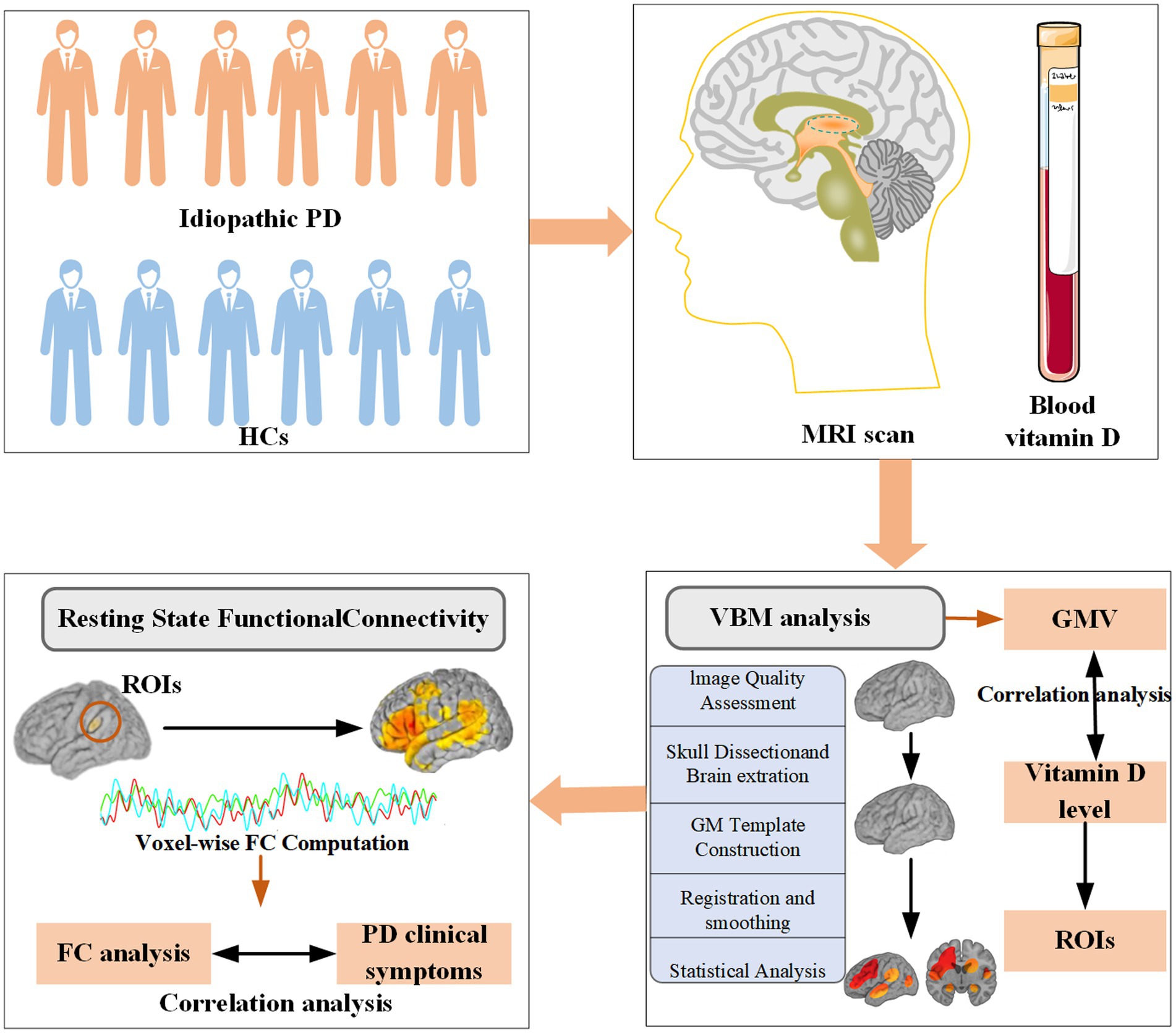 Patients were consecutively recruited throughout the year from outpatient clinics specializing in movement disorders at the Second Xiangya Hospital of Central South University. Before analysis, data completeness was assessed, and participants with missing MRI, serum 25-hydroxyvitamin D, or questionnaire data were excluded from the corresponding analyses. Because the proportion of missing data was minimal (<5%), no data imputation was performed. In the end, 34 patients with idiopathic PD were included in this cross-sectional study. All included patients met the movement disorder society (MDS) clinical diagnostic criteria for PD (Postuma et al., 2015). Patients were followed for a minimum of 12 months, with the diagnosis reassessed and confirmed at the end of the follow-up period. Exclusion criteria at enrollment included the diagnosis of secondary Parkinson-plus syndromes, parkinsonism, gene-related PD, use of vitamin D supplements, history of any chronic disease, or the use of medications that could potentially impact the absorption of vitamin D. Additionally, 21 healthy controls (HCs), matched to PD patients for age, sex, and years of education, were recruited from volunteers and the spouses of PD patients. All controls were cognitively normal, with no symptoms of PD or history of neurological diseases. Controls were excluded if they had a first- or second-degree relative with PD, and the remaining exclusion criteria were the same as those for the PD group. The relatively small sample size was mainly due to the strict inclusion criteria and the availability of eligible PD patients who completed all imaging and serum assessments. Considering the exploratory nature of this study and our earlier research, which reported a medium sized sample linking vitamin D to PD (PD: N = 330, HC: N = 209) (Lv et al., 2021), the current sample size is considered sufficient to potentially detect meaningful group differences with reasonable statistical power. The study procedures are described in Figure 1. The study was approved by the ethics committee of the Second Xiangya Hospital of Central South University. Informed written consent was obtained from all subjects prior to their inclusion in the study.