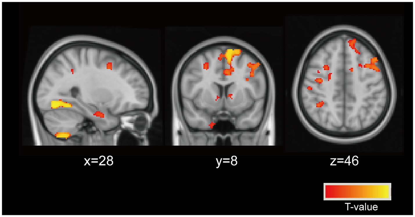 Figure 2. Neuronal vulnerable areas associated with vitamin D levels. The particular voxel located at coordinates (MIN, x = 28, y = 8, z = 46) were identified as the vulnerable areas associated with vitamin D levels in PD patients (controlling for age, and sex). This voxel predominantly encompassed the bilateral middle frontal gyrus (MFG), superior frontal gyrus (SFG).
