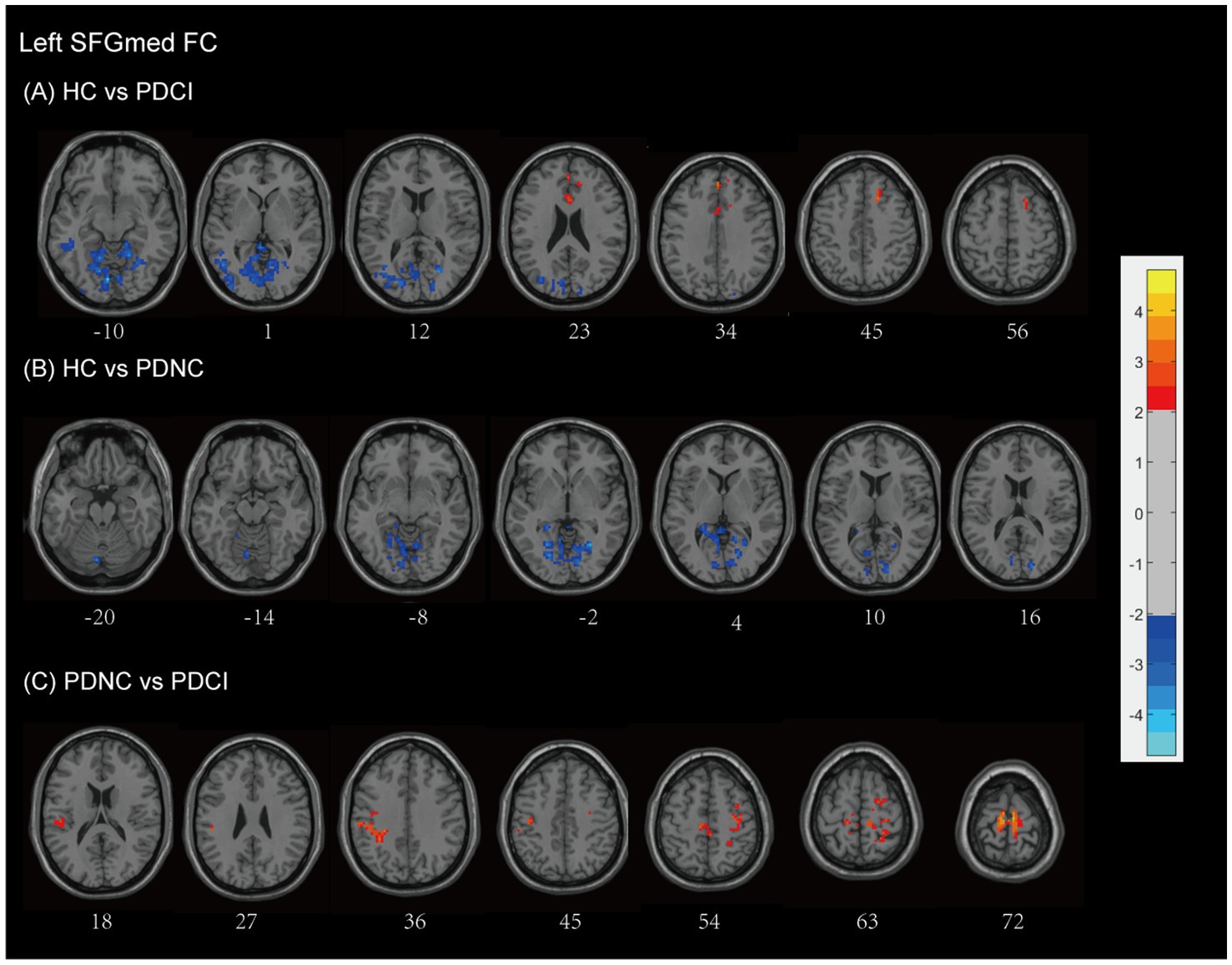 Figure 3. Left SFGmed functional network differences between the subgroups of PD patients and healthy controls. (A) PD-CI vs. HC: Increased functional connectivity (FC) in occipital, temporal, cerebellar, and limbic regions (blue); decreased FC in middle frontal and cingulate areas (red). (B) PD-NC vs. HC: Increased FC in occipital and limbic regions (blue). (C) PD-CI vs. PD-NC: Decreased FC in frontal–parietal sensorimotor areas (red). All findings are corrected for multiple comparisons, at AlphaSim, p < 0.05. Color bar represents T-values; coordinates are in MNI space. PD-NC, Parkinson’s disease with normal cognition; PD-CI, Parkinson’s disease with cognitive impairment; HC, healthy control; SFGmed, the medial of superior frontal gyrus.