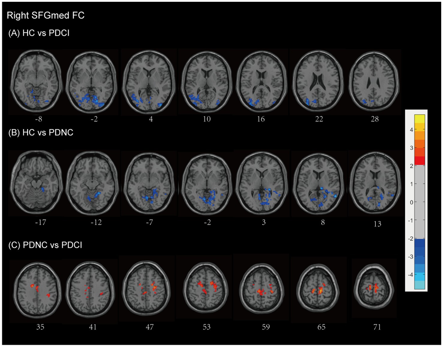 Figure 4. Right SFGmed functional network differences between the subgroups of PD patients and healthy controls. (A) PD-CI vs. HC: Increased functional connectivity (FC) in the occipital lobe and temporal lobe (blue). (B) PD-NC vs. HC: Increased FC in occipital the occipital lobe, temporal lobe, and limbic areas (blue). (C) PD-CI vs. PD-NC: Decreased FC in frontal–parietal–cingulate areas (red). All findings are corrected for multiple comparisons, at AlphaSim, p < 0.05. Color bar represents T-values; coordinates are in MNI space. PD-NC, Parkinson’s disease with normal cognition; PD-CI, Parkinson’s disease with cognitive impairment; HC, healthy control; SFGmed, the medial of superior frontal gyrus.