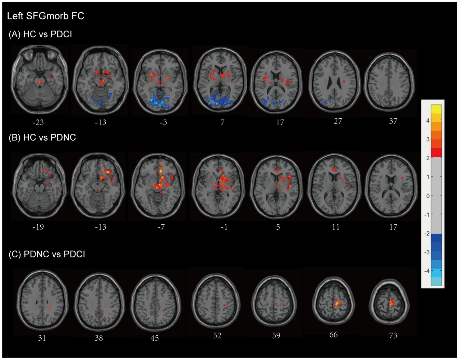 Figure 5. Left SFGmorb functional network differences between the subgroups of PD patients and healthy controls. (A) PD-CI vs. HC: Decreased functional connectivity (FC) was mainly observed in subcortical and frontal–limbic regions (red), increased FC was found with posterior cortical areas, mainly in the occipital, temporal, parietal (blue). (B) PD-NC vs. HC: Decreased FC primarily in fronto-striatal and limbic circuits (red). (C) PD-CI vs. PD-NC: Further FC reductions in precentral, medial frontal, and paracentral regions (red). All findings are corrected for multiple comparisons, at AlphaSim, p < 0.05. Color bar represents T-values; coordinates are in MNI space. PD-NC, Parkinson’s disease with normal cognition; PD-CI, Parkinson’s disease with cognitive impairment; HC, healthy control; SFGmorb, medial orbital of superior frontal gyrus.