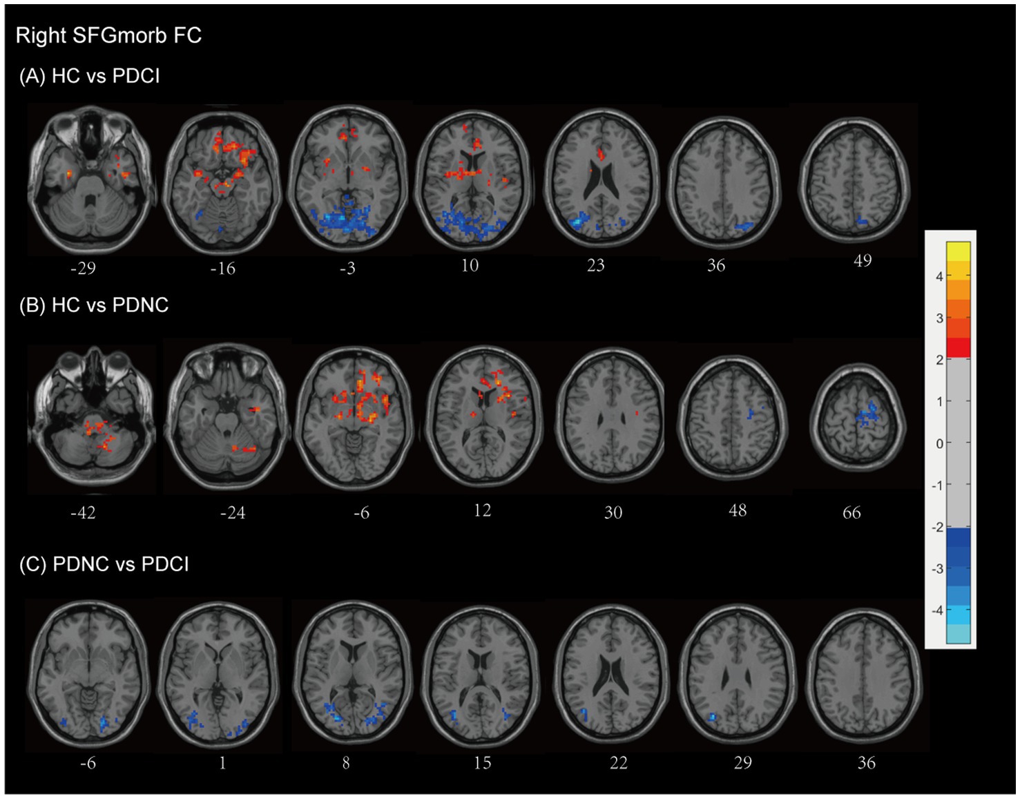 Figure 6. Right SFGmorb functional network differences between the subgroups of PD patients and healthy controls. (A) PD-CI vs. HC: Decreased functional connectivity (FC) in frontal–subcortical and limbic regions (red); increased FC in occipital lobe and temporal lobe, parietal lobe, posterior cingulate (blue). (B) PD-NC vs. HC: Decreased FC in fronto–striato–limbic and cerebellar networks (red); increased FC in motor-related frontal regions (blue). (C) PD-CI vs. PD-NC: PD-CI patients showed higher FC with several posterior and temporal regions (blue). All findings are corrected for multiple comparisons, at AlphaSim, p < 0.05. Color bar represents T-values; coordinates are in MNI space. PD-NC, Parkinson’s disease with normal cognition; PD-CI, Parkinson’s disease with cognitive impairment; HC, healthy control; SFGmorb, medial orbital of superior frontal gyrus.
