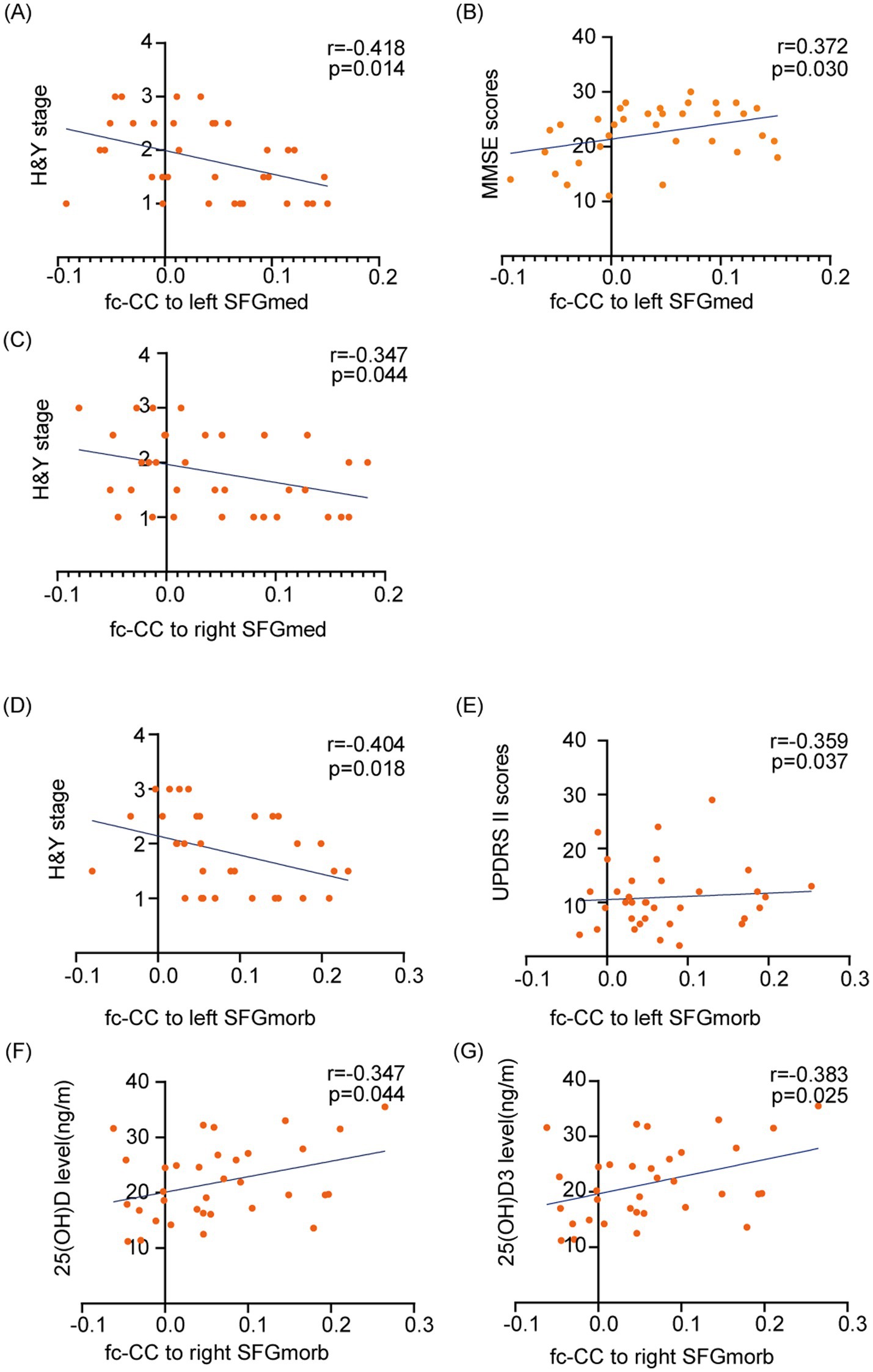 Figure 7. Correlations between disease severity, cognitive function, vitamin D levels, and functional connectivity within the SFG functional network. The fc-CC values within the SFG network are associated with PD clinical symptoms, including Hoehn and Yahr stage, UPDRS II scores, cognitive dysfunction, and vitamin D levels. (A–C) Associations between fc-CC values of the left and right SFGmed and H&Y stage or MMSE scores. (D, E) Associations between fc-CC values of the left SFGmorb and H&Y stage or UPDRS II scores. (F, G) Associations between fc-CC values of the right SFGmorb and serum 25(OH)D and 25(OH)D₃ levels. Each dot represents one PD participant; lines indicate linear regression fits. Pearson’s r and p-values are shown for each correlation. SFGmed, Medial of superior frontal gyrus; SFGmorb - Medial orbital of superior frontal gyrus.