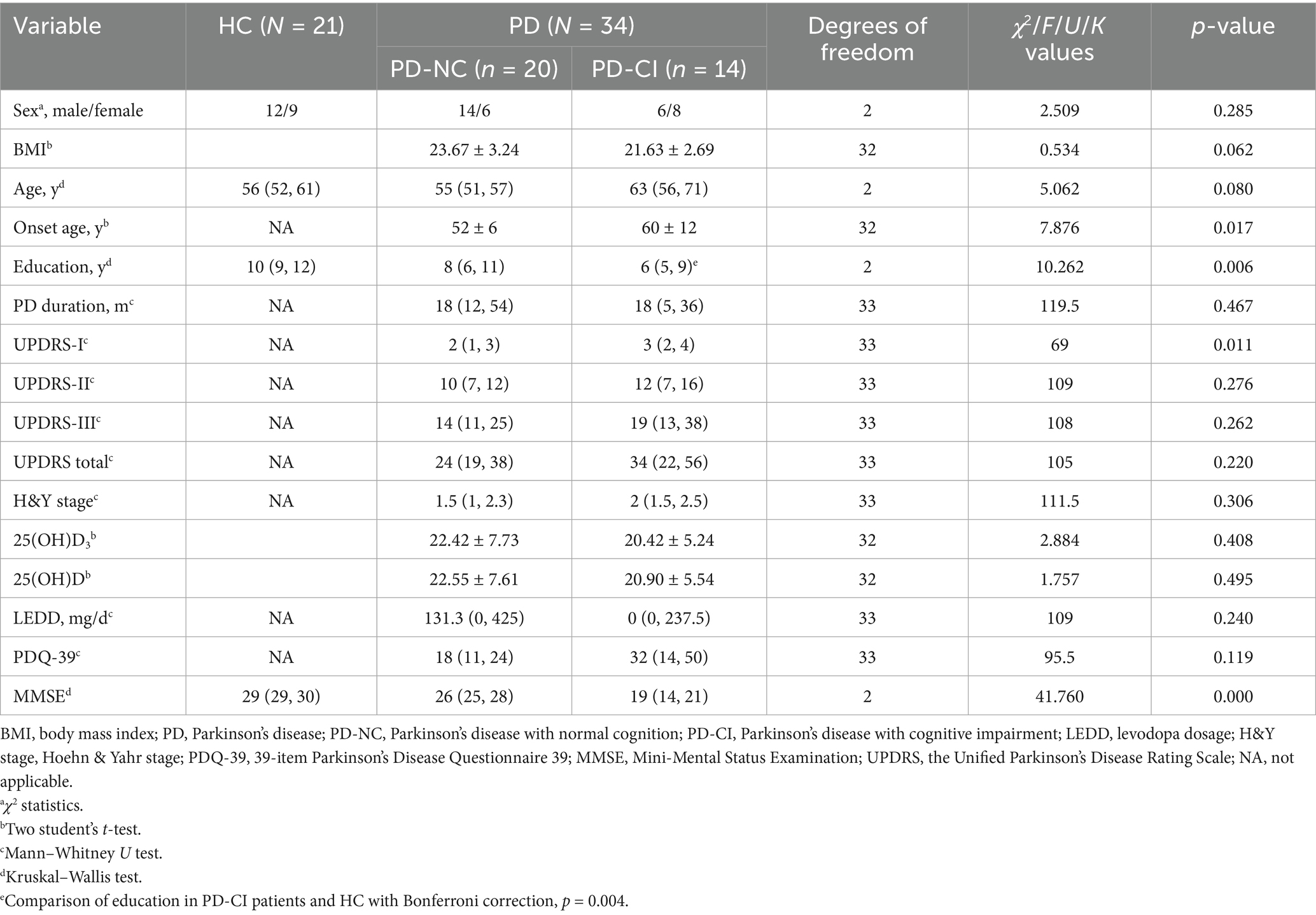 The demographic and clinical characteristics, as well as vitamin D levels, of the 34 PD patients and 21 HCs are summarized in Table 1. No significant differences were found between the HC group and the PD subgroup in terms of age, BMI, and sex. Additionally, there were no statistically significant differences between the PD-CI and PD-NC group regarding disease duration, UPDRS scores (II, III, IV, and total), Hoehn and Yahr stage, Levodopa Equivalent Daily Dose (LEDD), and Parkinson’s Disease Questionnaire (PDQ-39) scores (p > 0.05). The onset age of patients in the PD-CI group was older than that of patients in the PD + NC group. Furthermore, the PD-CI subgroup had significantly fewer years of education compared to the PD-NC subgroup [6 (5, 9) vs. 10 (9, 12); Bonferroni corrected p = 0.002]. The PD-CI subgroup also exhibited lower MMSE scores. No significant differences were observed in the levels of 25(OH)D3 between the two subgroups. Similarly, there were no significant differences in the levels of 25(OH)D, although the levels of 25(OH)D were lower in the PD-CI group compared to the PD-NC group, which may be related to the small sample size.