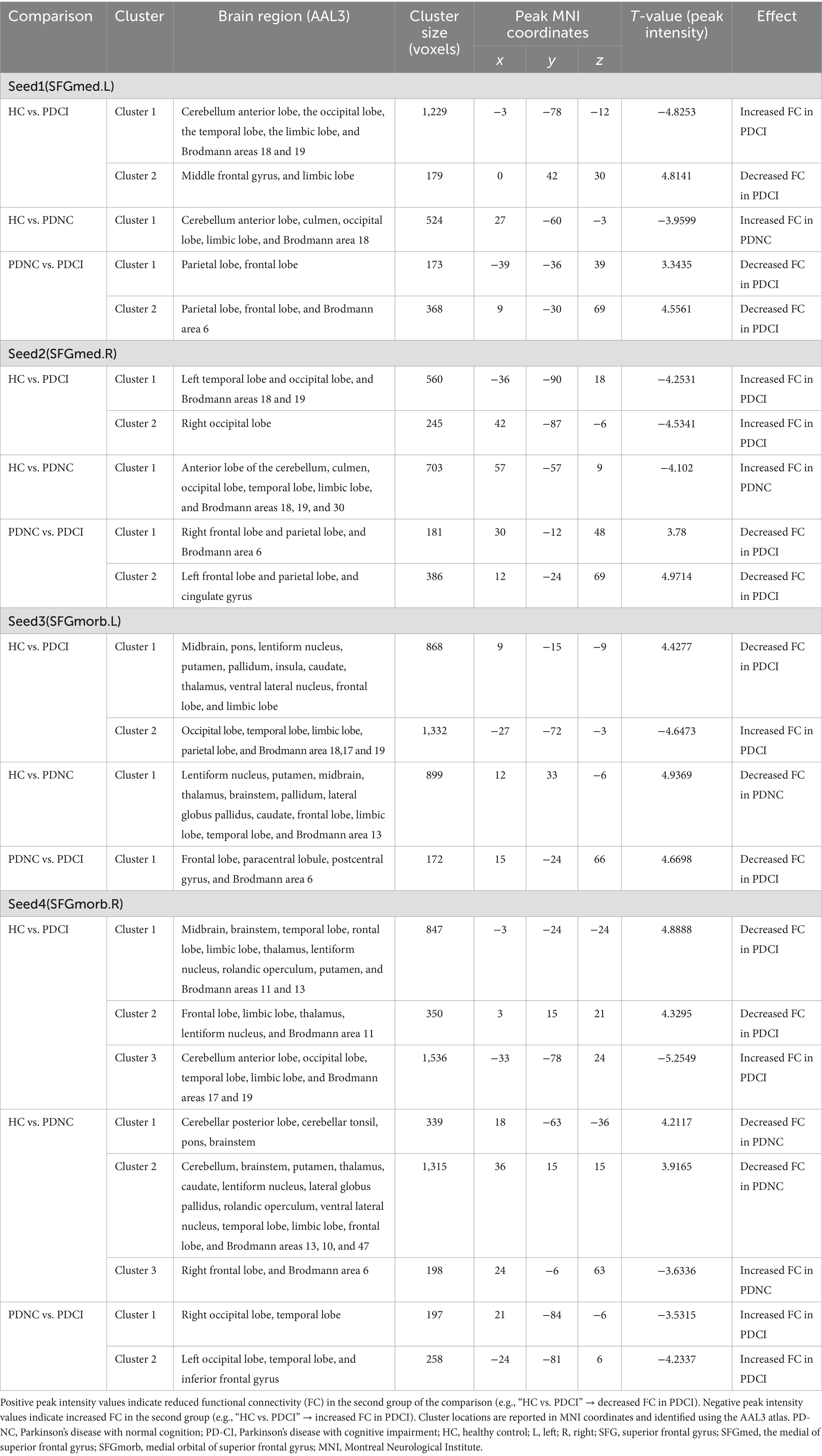 In the VBM analysis, GMV differences between PD patients and HCs were more pronounced in the SFG compared to the MFG (see Figure 2). Furthermore, we analyzed whole-brain functional connectivity (FC) patterns across the HC, PD-NC, and PD-CI groups using MFG as the ROI and found no significant association between cognitive function and the MFG functional network (data not provided). To further assess the impact of abnormal vitamin D levels on relevant resting-state networks, we selected clusters encompassing the bilateral SFG, specifically the medial SFG (SFGmed) and medial orbital SFG (SFGmorb) regions, as four ROIs. These regions were used to analyze FC patterns across the entire brain among the three groups. Spherical seed regions with a radius of 2 mm were created based on the AAL3 template (Rolls et al., 2020) within MATLAB R2019B software.