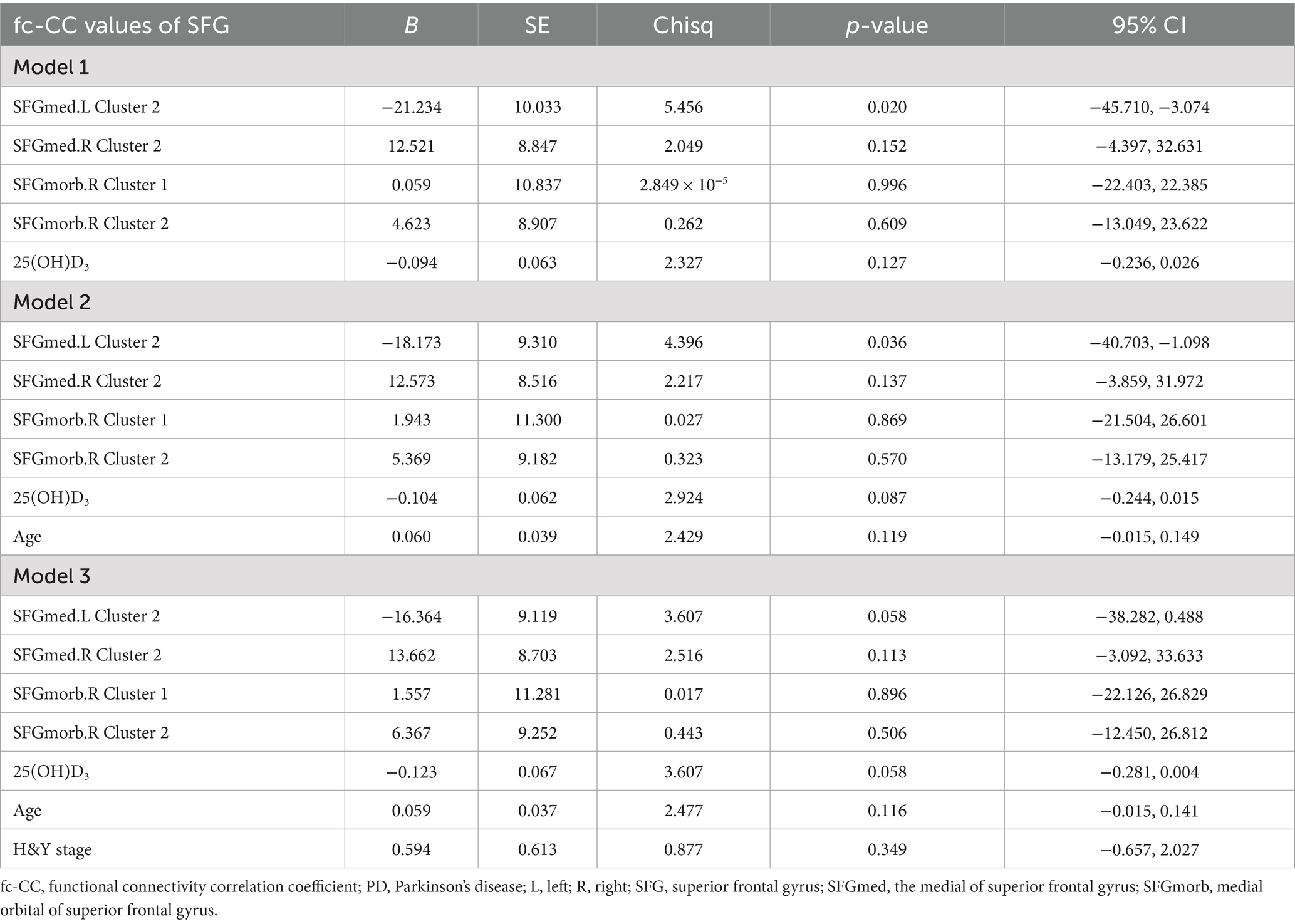 Supplementary Table 1 presents the results of a logistic regression analysis assessing the impact of FC in the SFG network and vitamin D levels on cognitive impairment in PD. SFGmed.L Cluster-2 shows a consistent negative association with cognitive impairment across all three models, with a statistically significant regression coefficient in Models 1 (B = −27.125, p = 0.026), 2 (B = −24.253, p = 0.040), and 3 (B = −22.817, p = 0.055), the latter approaching statistical significance. Additionally, in Model 3, 25(OH)D3 is significantly associated with cognitive impairment (B = −0.173, p = 0.047). A trend toward significance is observed for SFGmed.R Cluster-2 (B = 0.185, p = 0.082), indicating a possible but non-significant positive relationship with cognitive impairment.
