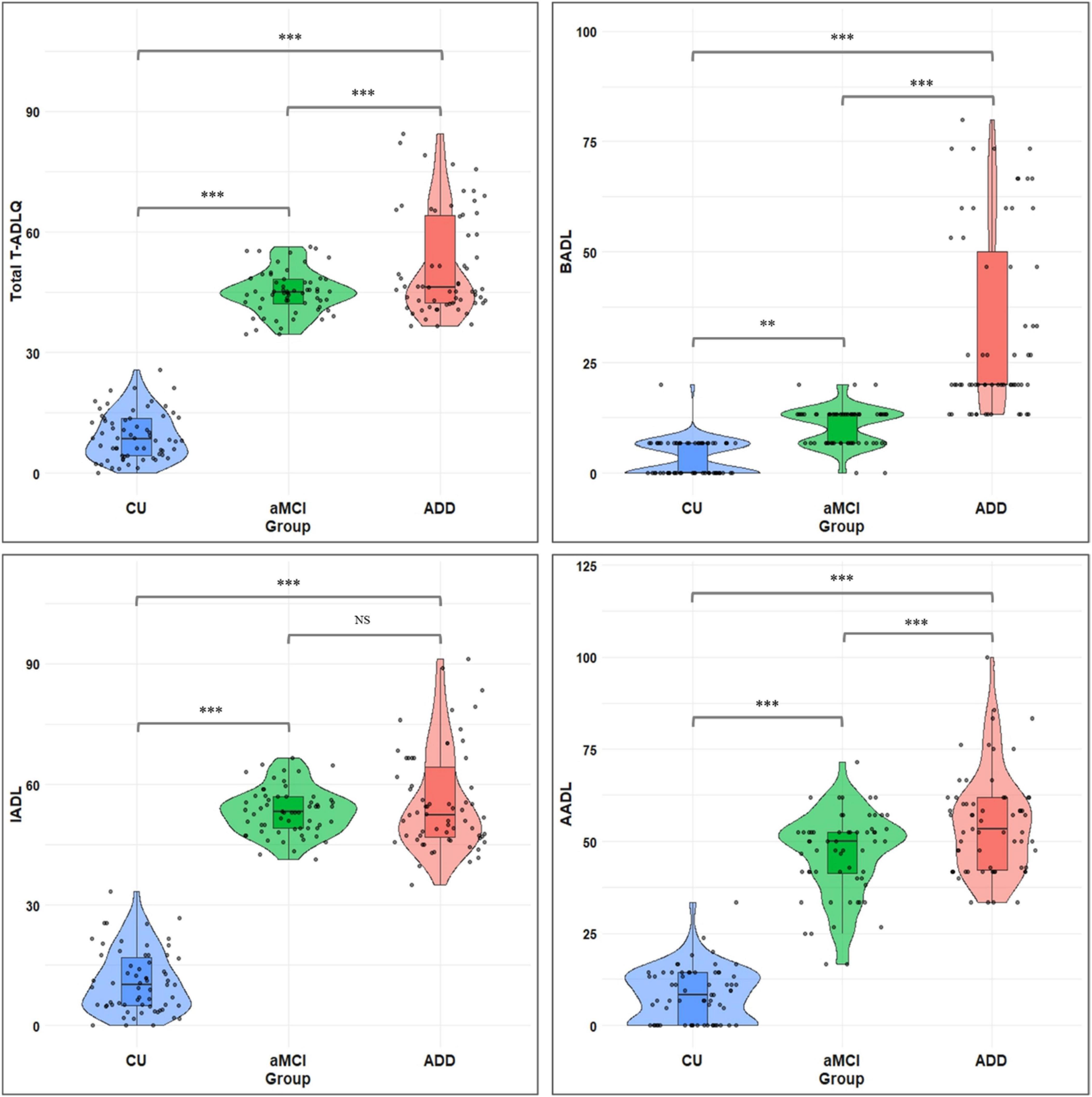 Figure 1. Total and subdomain T-ADLQ performance across CU, aMCI, and ADD groups. T-ADLQ, the Technology Activities of Daily Living Questionnaire; BADL, basic activities of daily living; IADL, Instrumental Activities of Daily Living; AADL, Advanced Activities of Daily Living; CU, Cognitively Unimpaired; aMCI, amnestic mild cognitive impairment; ADD, Alzheimer’s Disease Dementia; NS, non-significant differences; ***p < 0.001; **p < 0.01.