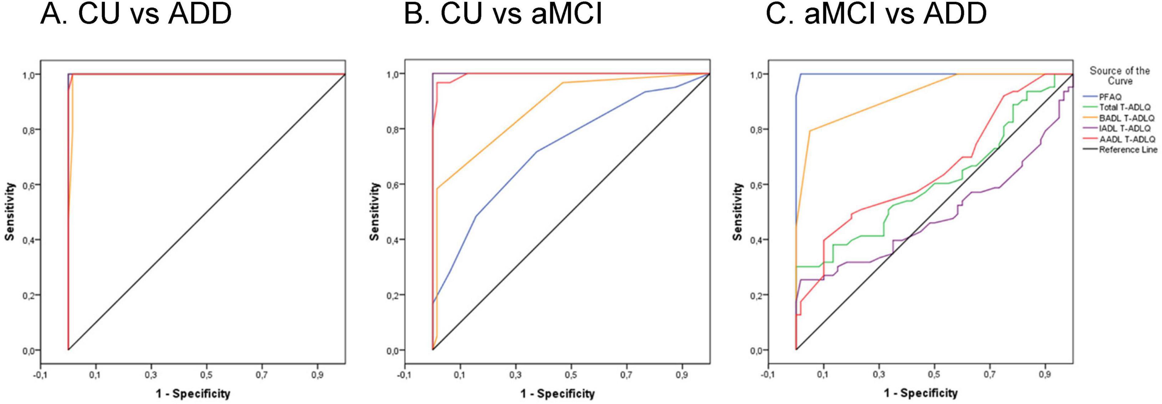 Figure 2. Receiver operating characteristic (ROC) curves for the total T-ADLQ, BADL, IADL, AADL, and PFAQ in discriminating between diagnostic groups. (A) CU vs. ADD. (B) CU vs. aMCI. (C) aMCI vs. ADD. CU, Cognitively unimpaired; ADD, Alzheimer’s Disease Dementia; aMCI, amnestic mild cognitive impairment.
