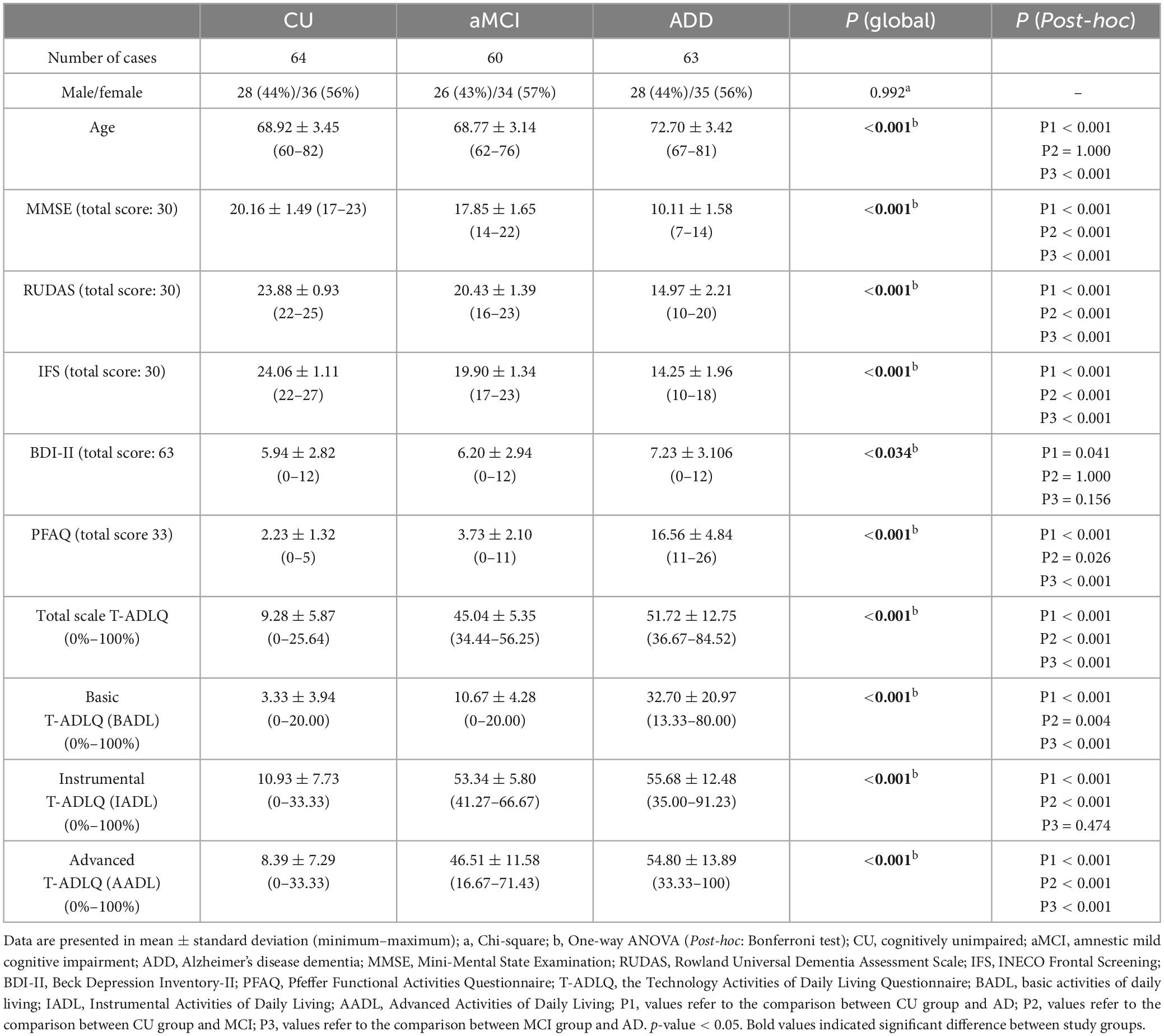 The total sample consisted of 187 non-formal education older adults, distributed across three diagnostic groups: 64 CU (36 women), 60 individuals with aMCI (34 women), and 63 patients with ADD (35 women). Table 1 presents the demographic and clinical characteristics of the sample.