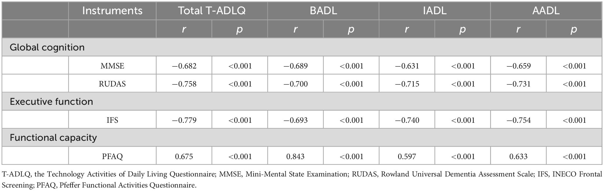 The internal consistency of the T-ADLQ was high (Cronbach’s alpha = 0.966), comparable to the results reported by Muñoz-Neira et al. (2012) in Chile (Cronbach’s alpha = 0.861). Spearman’s correlations between the T-ADLQ, RUDAS, and IFS suggest that the T-ADLQ is a good predictor of both global cognition and executive function. These findings are consistent with previous research highlighting the relationship between executive dysfunction and the loss of instrumental daily living skills, particularly in the progression from MCI to Alzheimer’s Disease (Maeshima et al., 2021). In contrast, the correlation between the T-ADLQ and the PFAQ was moderate (rho = 0.675). This discrepancy may be attributed to the broader scope of the T-ADLQ, which assesses three domains of daily functioning, while the PFAQ focuses exclusively on IADLs. This difference in coverage may influence the sensitivity of each tool in detecting functional changes.