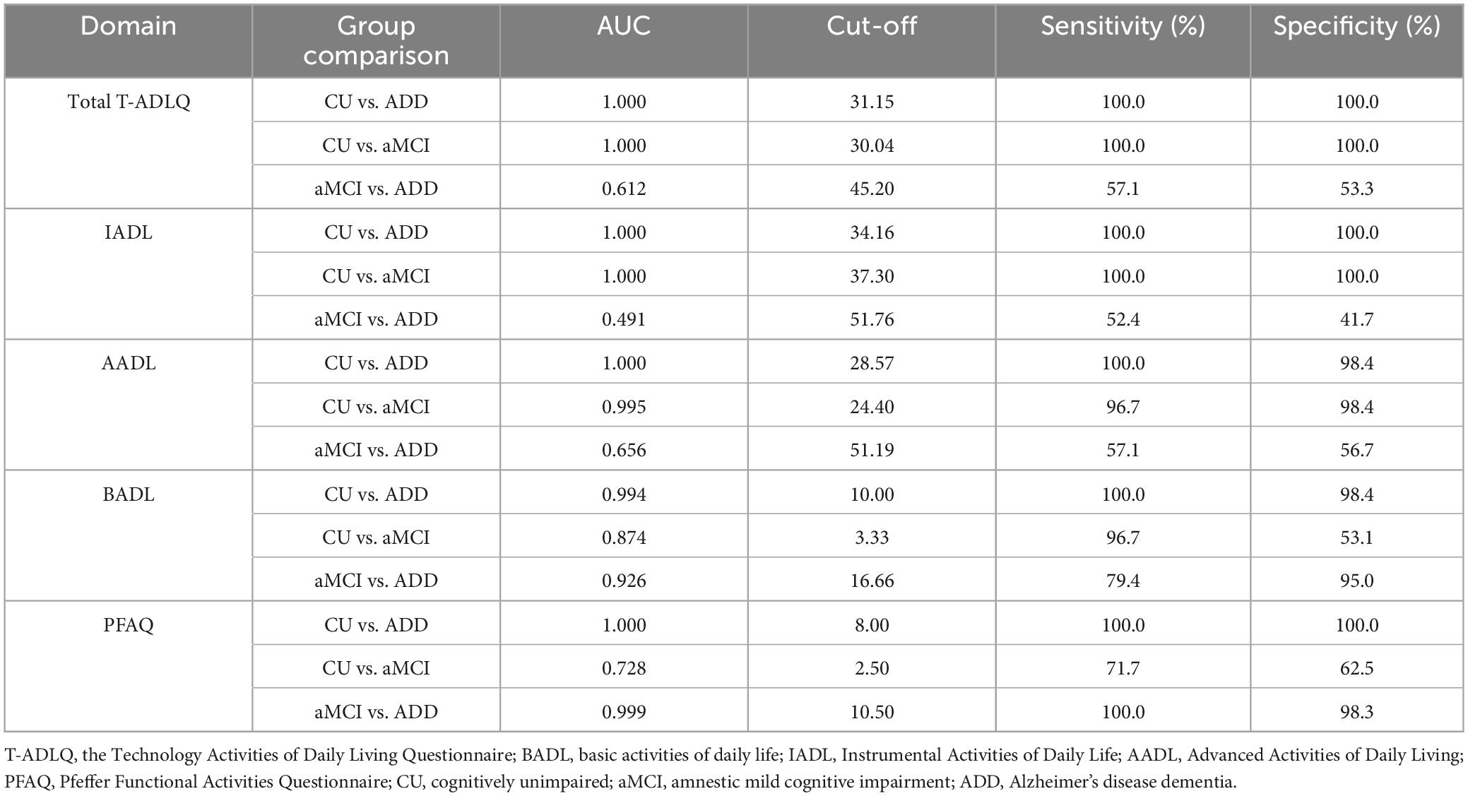 Table 3. Receiver operating characteristic (ROC) analysis of T-ADLQ and its three subdomains in cognitively unimpaired, amnesic MCI, and Alzheimer’s disease dementia individuals.