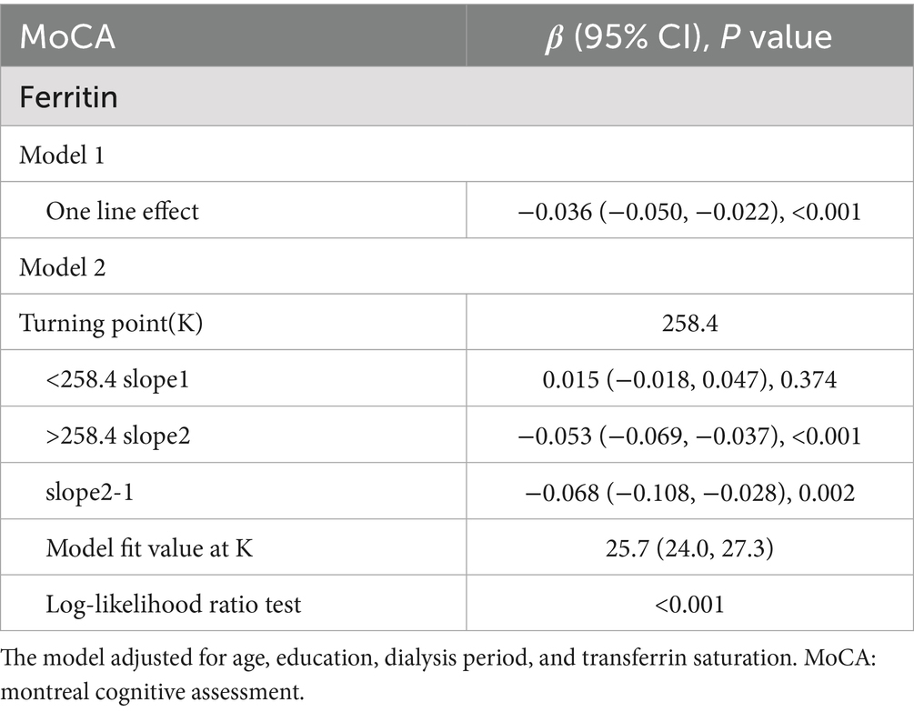 Iron, a pivotal regulator that mediates neurotoxic effects, has been closely associated with cognitive impairment through pathological iron accumulation. Studies demonstrate that iron overload induces neuronal damage via oxidative stress, inflammatory cascades, and ferroptosis pathways (Li et al., 2023; Xie et al., 2023). The heightened expression of transferrin receptor 1 (TfR1) within the central nervous system potentially facilitates iron ion transport across the blood–brain barrier (BBB), leading to cerebral iron deposition and subsequent neurodegenerative pathologies (Li et al., 2012; Zhang et al., 2021). Elevated serum ferritin levels exhibit significant correlations with cognitive impairment disorders including Alzheimer’s disease and cerebral hemorrhage, underscoring its neurotoxic potential (Lan et al., 2021; Li et al., 2024). Additionally, there is also evidence indicating that improvements in SF levels are associated with enhanced cognitive abilities, particularly in working memory, language processing, and executive functions (Raz et al., 2022; Rosell-Diaz et al., 2024). However, it is crucial to acknowledge that this association between peripheral ferritin and cognitive function stands in contrast to the broader body of research in Alzheimer’s disease. Most studies investigating Alzheimer’s disease have failed to detect consistent correlations between peripheral iron parameters (such as serum ferritin, transferrin saturation, and serum iron) and cognitive decline (Milward et al., 2010; Wang et al., 2025). Instead, compelling evidence in Alzheimer’s disease and other neurodegenerative disorders (e.g., Parkinson’s disease, vascular dementia) highlights that regional cerebral iron accumulation is the key pathological correlate of cognitive impairment (Moon et al., 2016; Guan et al., 2022). Current study only reveals a marked inverse correlation between serum ferritin concentrations and cognitive performance in peritoneal dialysis population. Multivariate regression analysis identifies both age and serum ferritin as independent risk factors for cognitive impairment. However, when using the Generalized Additive Model and curve fitting for curve analysis, an inverted U-shaped relationship was identified between serum ferritin levels and MoCA scores in peritoneal dialysis patients and the β value are low. Therefore, further research is necessary to determine the clinical significance of these findings. Mechanistically, iron accumulation may impair cognition through three synergistic pathways: (1) Iron-mediated free radical generation exacerbating oxidative damage (Munoz and Humeres, 2012); (2) Microglial activation triggering pro-inflammatory cytokine release (e.g., IL-6, TNF-α), thereby disrupting synaptic plasticity (Wang et al., 2023); (3) Synergistic interaction with uremic toxins to accelerate β-amyloid deposition. Clinically, the threshold of serum ferritin ≥258.4 μg/L shows promise as an early warning indicator for cognitive decline, with dynamic monitoring enabling timely interventions. Nevertheless, large-scale prospective studies remain imperative to validate these findings.