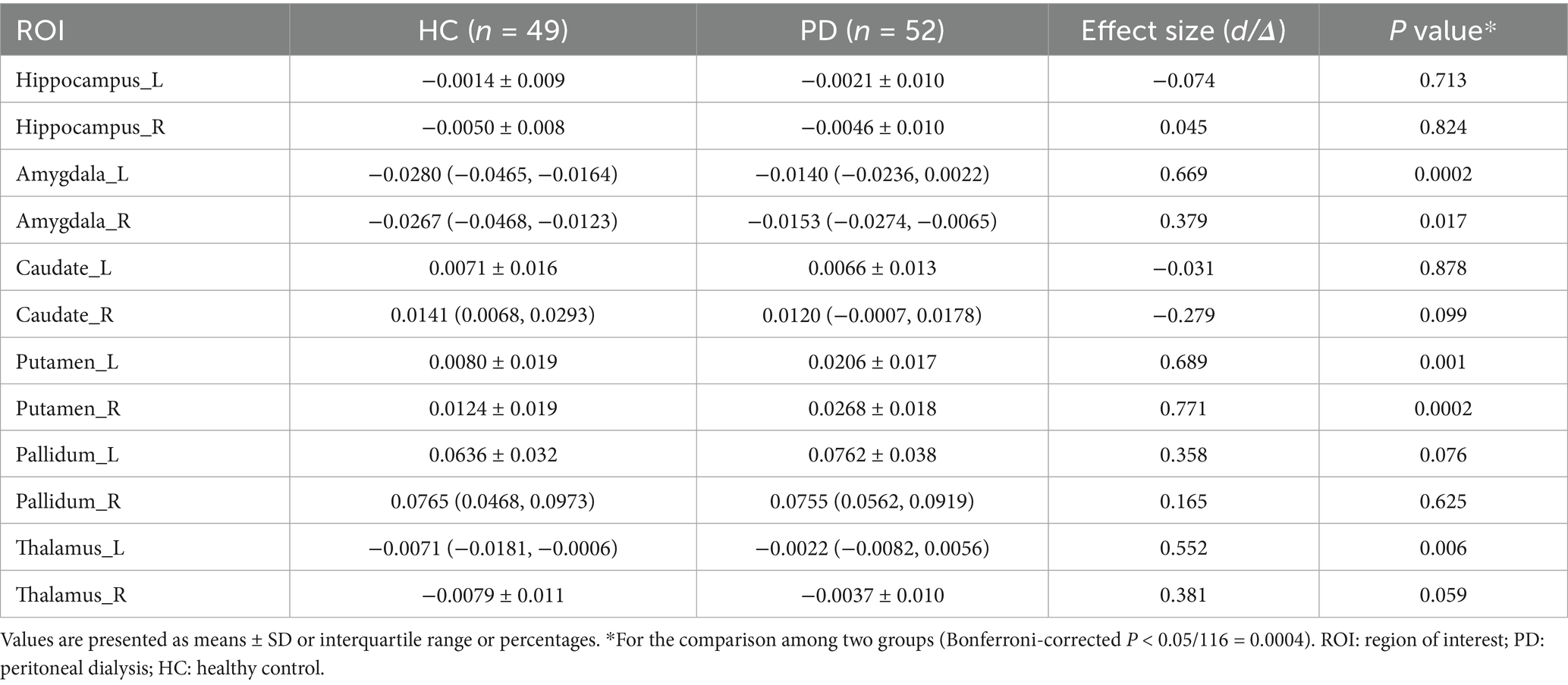 Previous studies have demonstrated that iron metabolism disorders represent one of the critical mechanisms underlying neurological complications in patients with CKD (Agarwal, 2011). ESRD patients with chronic anemia often require treatment with erythropoietin (EPO) and iron supplementation, which may predispose them to systemic iron overload. Research involving hemodialysis patients has revealed a significant increase in iron deposition in brain regions such as the caudate, which is associated with cognitive decline (Chai et al., 2015). Due to differences in treatment modalities (e.g., continuous solute clearance and hemodynamic stability), the iron metabolism characteristics of PD patients may differ from those observed in hemodialysis patients. Animal studies indicate that the accumulation of uremic toxins can upregulate iron transporters, such as transferrin receptor 1, in the brain, thereby promoting iron deposition across the blood–brain barrier (Deguchi et al., 2006). Nevertheless, the specific pattern of iron deposition in distinct brain regions and its association with cognitive impairment in PD patients remains poorly understood. The present study revealed that the left amygdala and right putamen in PD patients exhibited significantly higher values compared to healthy controls, with the former showing a negative correlation with MoCA scores. These findings suggest that cognitive impairment in peritoneal dialysis patients may be mechanistically linked to iron dysregulation in limbic structures, particularly the amygdala. As a core structure of the limbic system, the abnormal deposition of iron in the amygdala may lead to the generation of free radicals, potentially impairing cognitive function through the following mechanisms. First, excessive iron ions catalyze the production of free radicals, disrupting synaptic plasticity and neurotransmitter balance (e.g., 5-HT and GABA systems), thereby directly affecting emotion regulation and memory consolidation (Thielen et al., 2019). Second, disrupted iron homeostasis may exacerbate anxiety and depressive-like behaviors by modulating the GABAergic neurotransmitter system to enhance aberrant activation of the amygdala-prefrontal neural circuitry, while simultaneously suppressing hippocampal-dependent cognitive processes (Alves et al., 2022; Arora et al., 2024; Zhang et al., 2023).