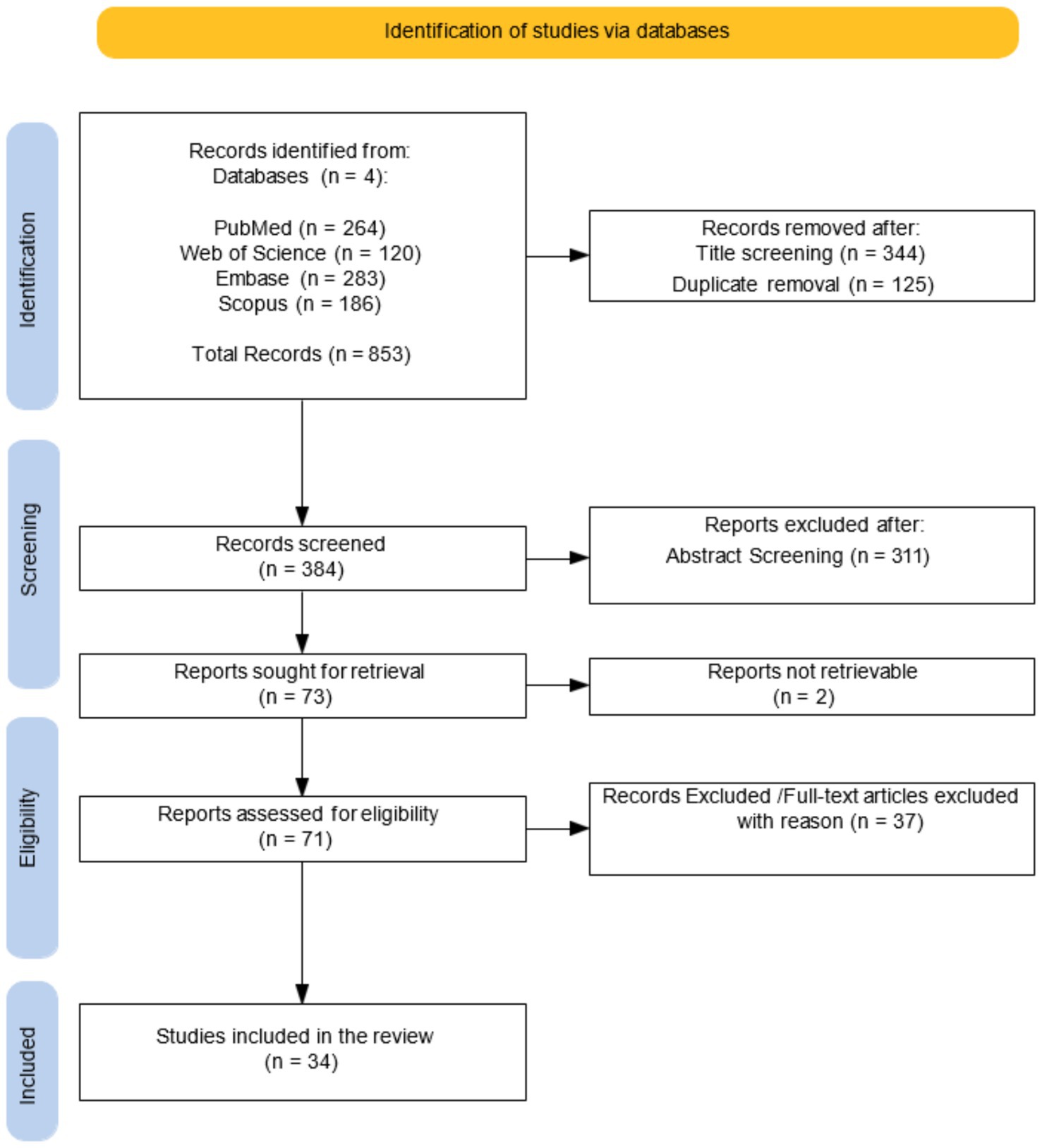 Flowchart illustrating a systematic review process. The identification stage shows 853 records from databases like PubMed, Web of Science, Embase, and Scopus. After removing duplicates and title screening, 384 records are screened. Abstract screening excludes 311, leaving 73 reports for retrieval. Two reports are not retrievable. Eligibility assessment leads to 71 reports, excluding 37. Finally, 34 studies are included in the review.