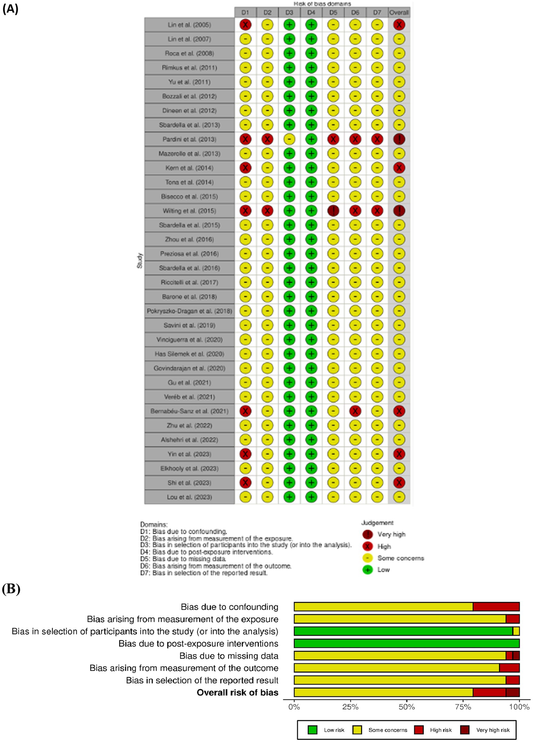 (A) Table showing risk of bias across various studies and domains, including confounding, exposure measurement, and participant selection. Symbols indicate risk levels: green for low, yellow for some concerns, and red for high/very high risk. (B) Horizontal bar chart displaying the distribution of risk levels across different domains, with segments colored to indicate low risk (green), some concerns (yellow), high risk (red), and very high risk (darker red).