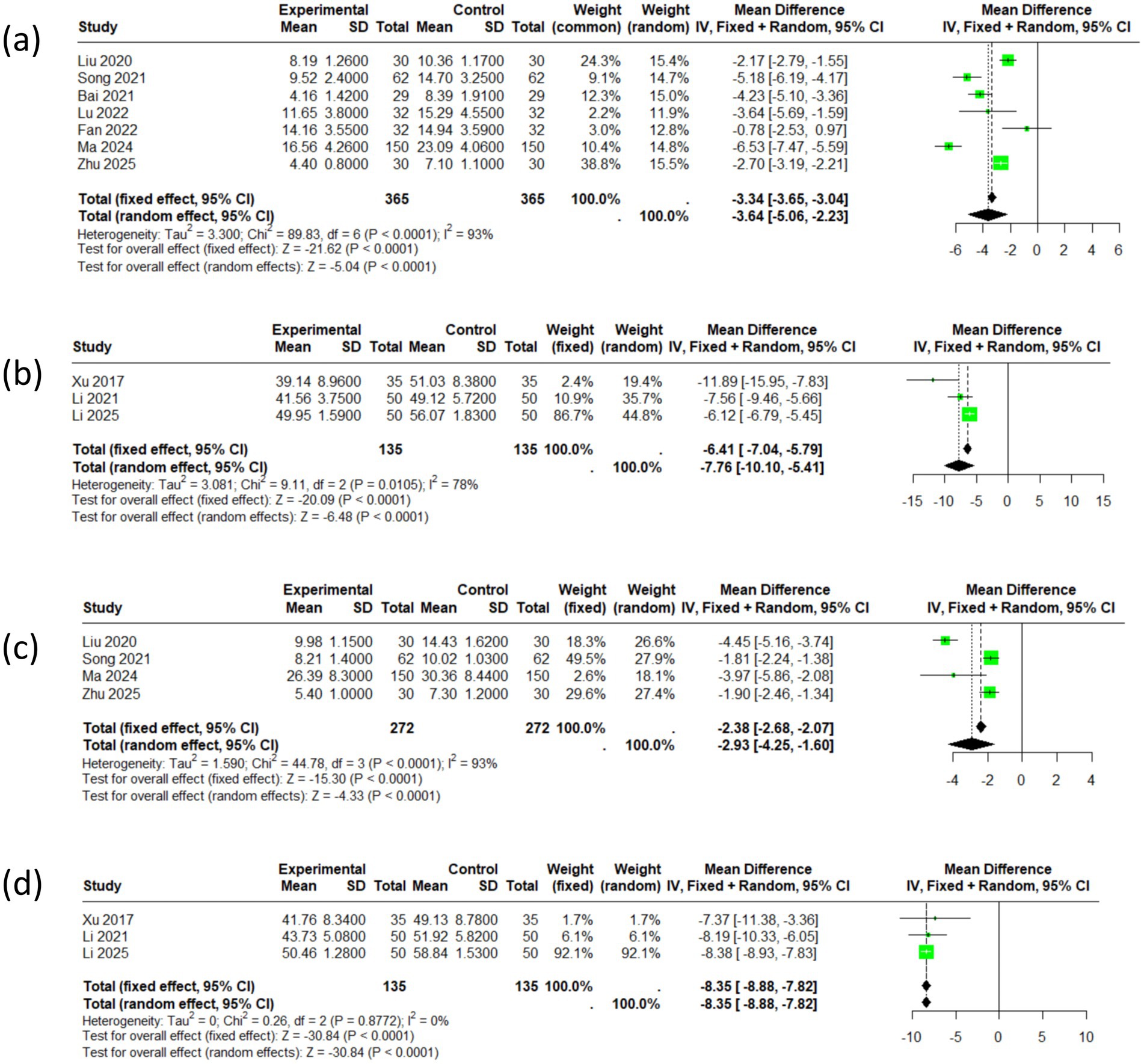 Four forest plot charts (a, b, c, d) display meta-analysis results for different studies. Each chart includes a table with study names, mean differences, standard deviations, confidence intervals, and weights. Green squares represent individual study estimates, while diamonds indicate overall effect estimates. Heterogeneity statistics and z-tests for effects are provided. Panels show varying mean differences and confidence intervals, reflecting individual and combined study effects.