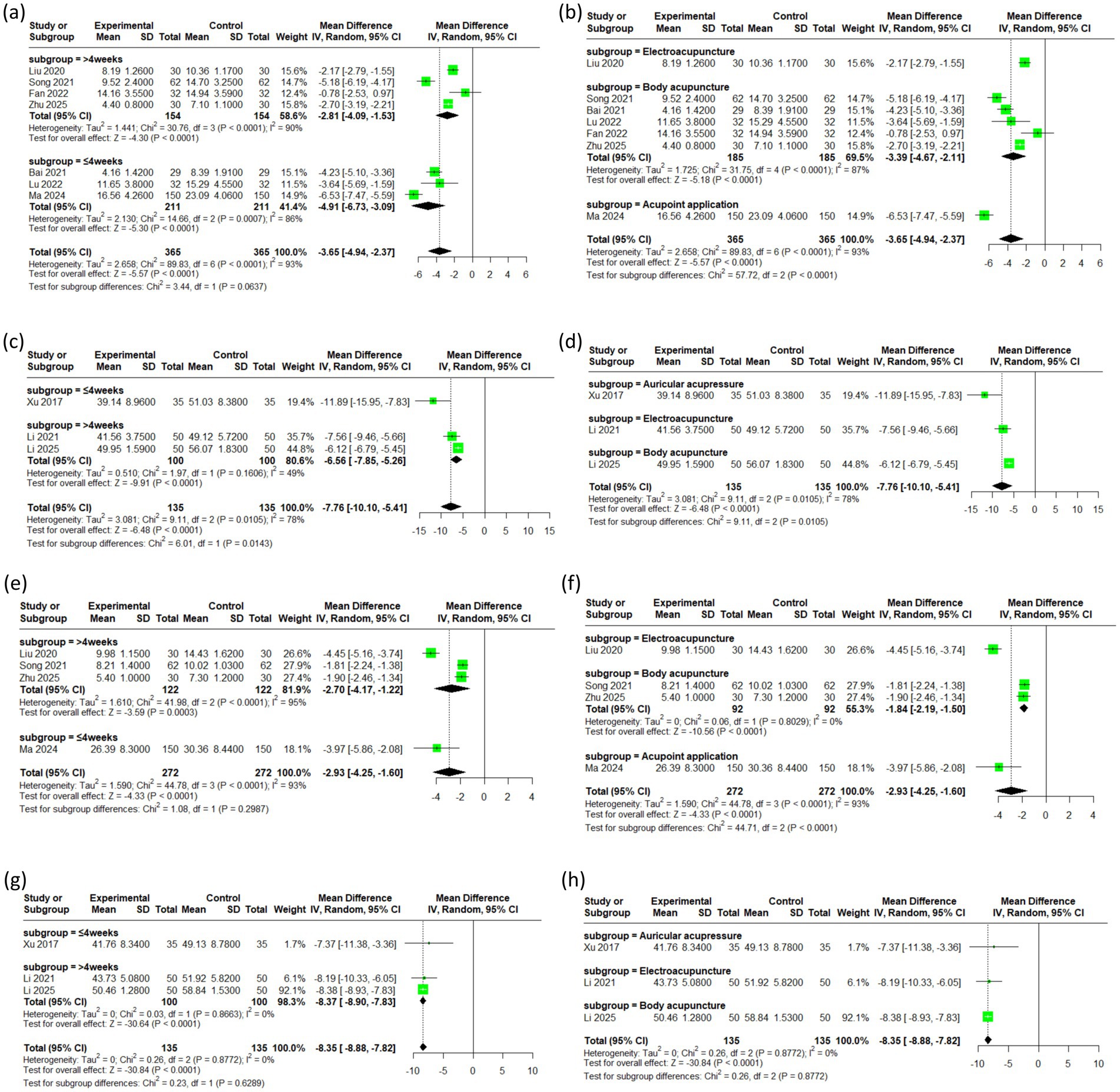 Forest plot comparing experimental and control groups across multiple studies for various acupuncture treatments. Each panel (a-h) shows treatment types like electroacupuncture, body acupuncture, and auricular acupressure. Data includes means, standard deviations, total numbers, and weight percentages. Mean differences with confidence intervals are visualized. Heterogeneity and overall effects are indicated below the graphs. Plots highlight individual and cumulative effects, with green squares representing study estimates and black diamonds representing overall estimates.