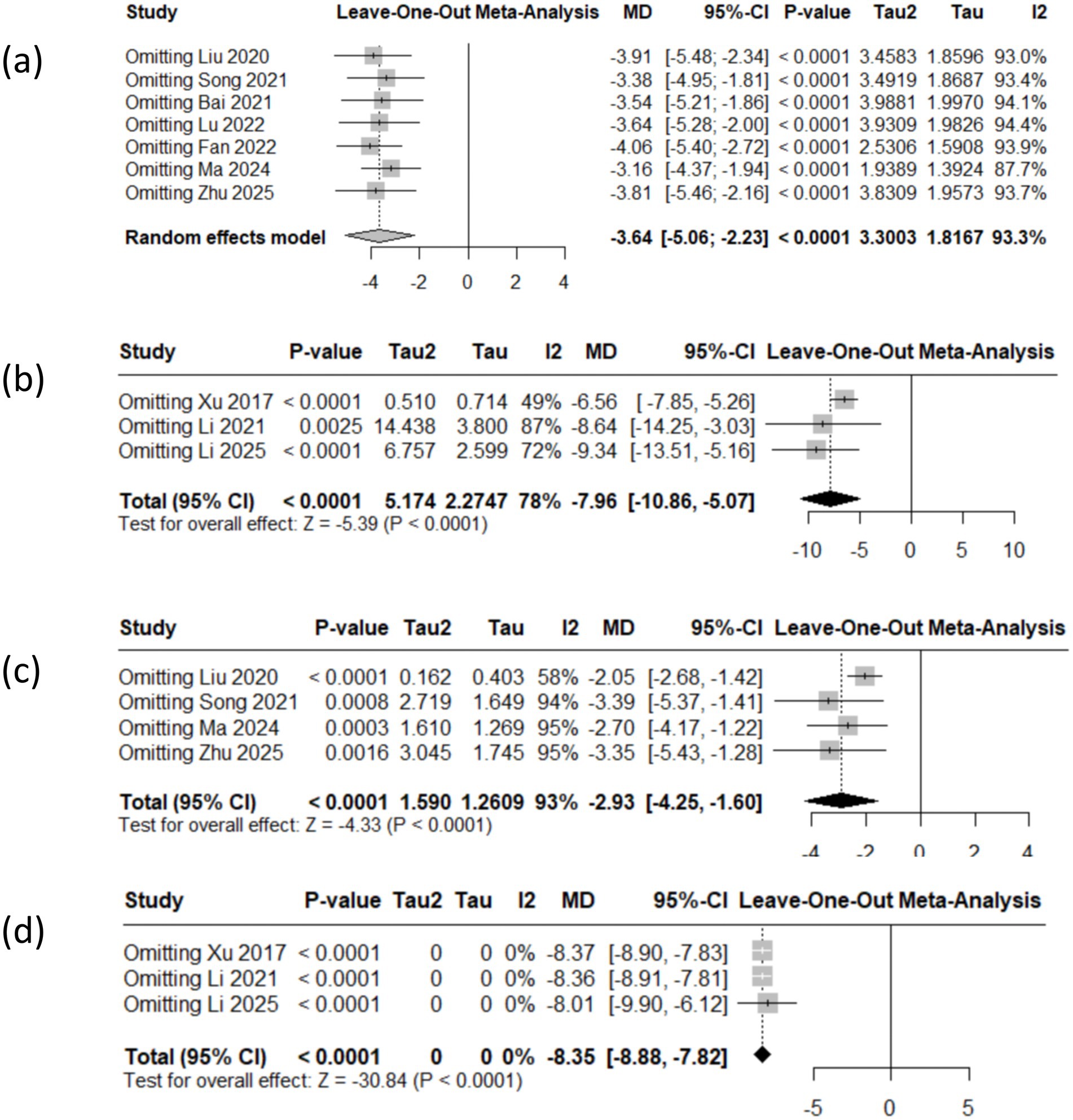 Four panels, labeled a, b, c, and d, display leave-one-out meta-analysis results using forest plots. Each panel includes a table listing studies omitted, with associated metrics: mean difference (MD), confidence intervals (CI), P-values, Tau², Tau, and I² statistics. Each plot visualizes the impact of excluding individual studies on the overall effect. Random effects models summarize each set.