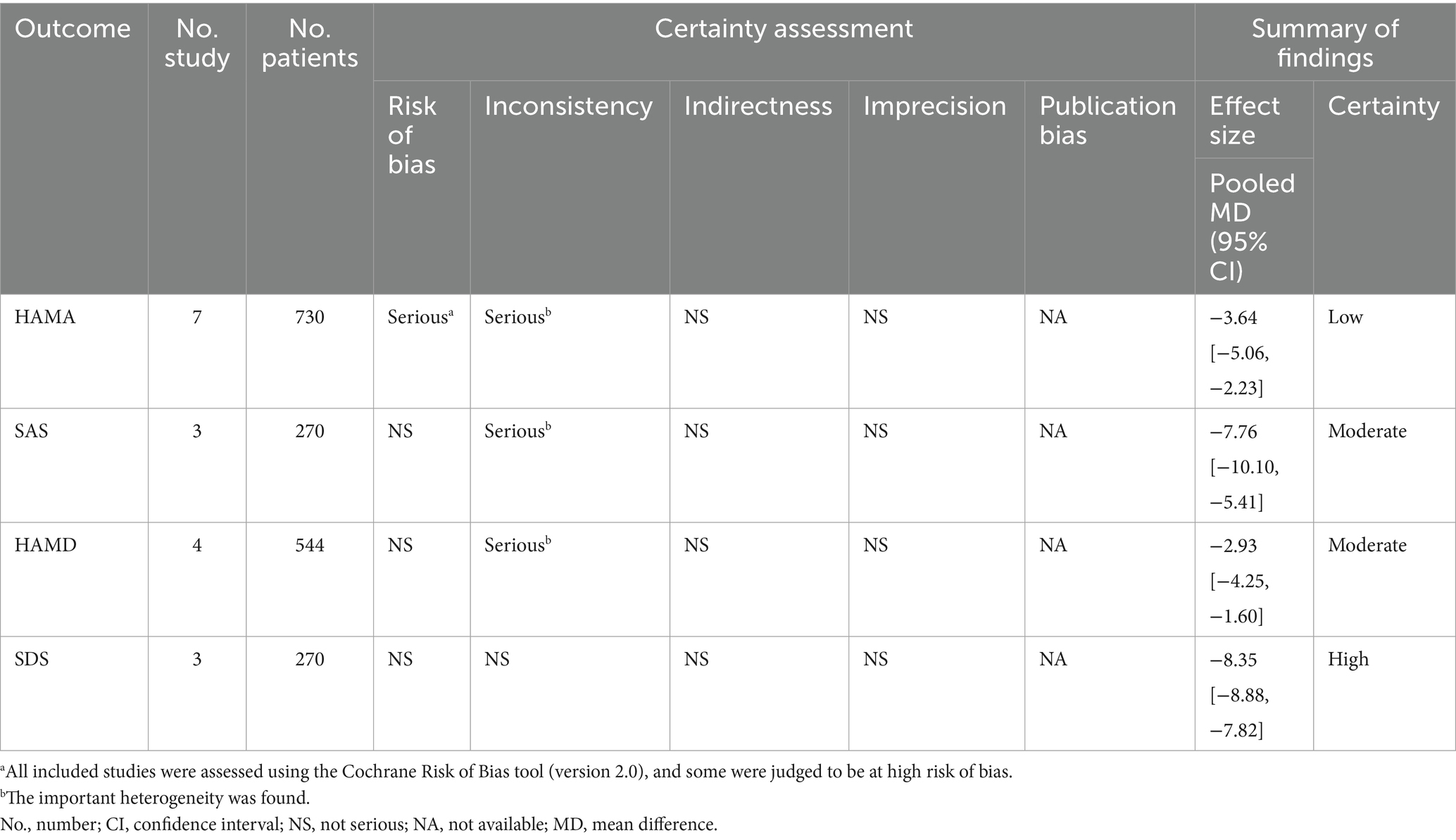 According to the GRADE approach, the quality of evidence was rated as high for HAMA, moderate for SAS and HAMD, and low for SDS (see Table 2).