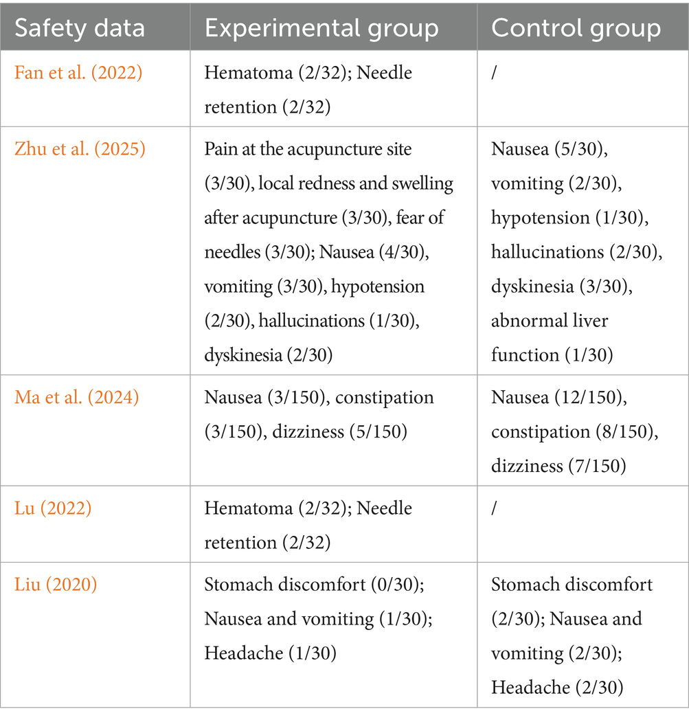 We extracted all safety events from the RCTs. A total of five documents mentioned adverse reactions after treatment. Among them, mild adverse reactions related to acupuncture included redness and swelling after needle insertion, hematoma, pain, needle retention, and fear of needles (Resting and drinking warm water can help alleviate the symptoms). Other adverse reactions included nausea and vomiting, hypotension, hallucinations, movement disorders, constipation, dizziness, headache, and abnormal liver function. However, due to incomplete reporting in the original documents, the causal relationship could not be fully determined (see Table 3).
