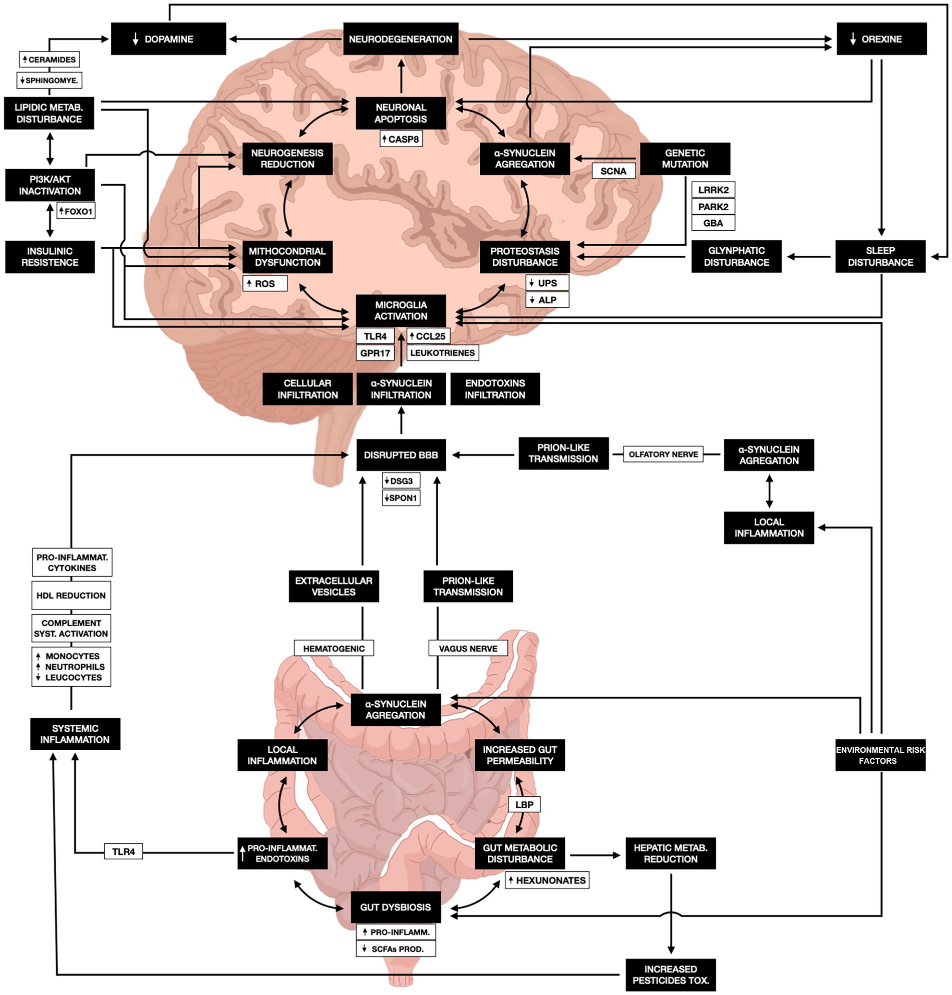 The pathophysiological complexity of PD necessitates an integrative and transdisciplinary framework. Rather than being solely characterized as a centrally initiated dopaminergic neurodegenerative disorder, PD should be conceptualized as a systemic condition wherein peripheral and central processes—encompassing metabolic, immunological, microbiological, and proteostatic pathways—interact dynamically over time (Figure 1).
